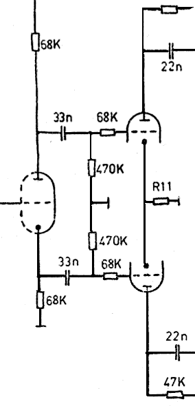 Le circuit utilise un déphaseur classique de type cathodyne, suivi d'un étage amplificateur à résistance de cathode commune non découplée (R11 = 1.5kΩ). Ce type de circuit produit deux signaux parfaits de même amplitude (mais de phase inverse) et l'impédance de sortie des deux tubes est identique. Ce montage à 3 triodes est appellé Williamson et permet de commander directement des tubes qui nécessitent une tension de commande élevée.