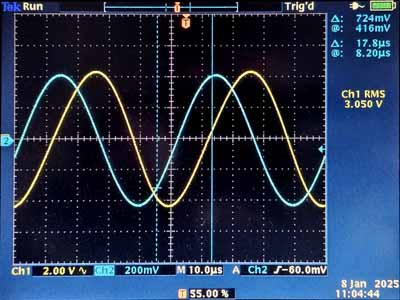 A droite le signal à l'entrée de l'ampli (cyan) et en sortie de l'ampli (jaune). Le déphasage commence à devenir important à 20kHz et c'est la raison (en fait: une des raisons) pour lesqulles l'amplificateur peut devenir instable quand il y a une contre réaction.