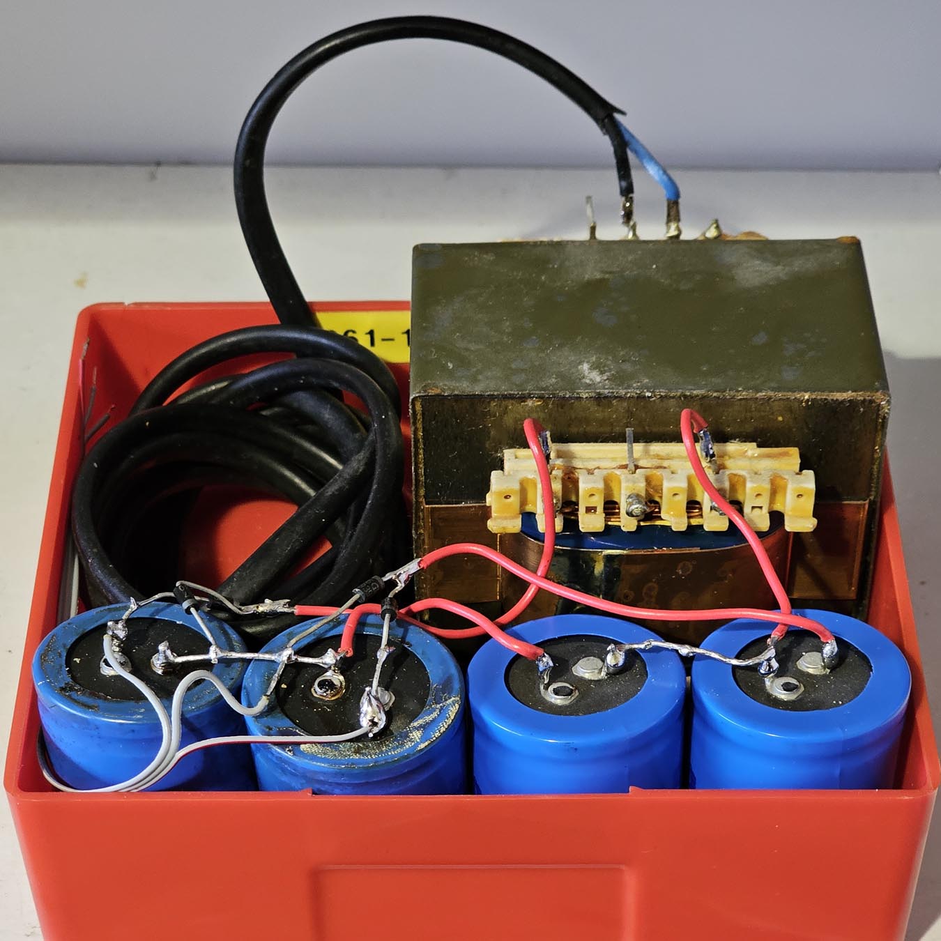Mon petit transfo d'alimentation haute tension standard pour réparer des amplis existants et tester de nouvelles configurations. Il utilise un transfo d'un petit amplificateur (à transistors) et deux doubleurs de tension. La seule différence avec une alimentation haute tension plus "normale" est le nombre double de condensateurs et le fait que la tension chute un peu moins en charge.