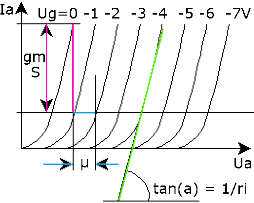 Le facteur d'amplification µ est la variation de la tension anodique pour une vatiation de la tension de la grille de 1V (ici de -1 à -2V) avec courant anodique maintenu constant. Les tubes avec un facteur d'amplification important sont utilisés dans les étages préamplificateurs.