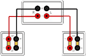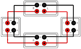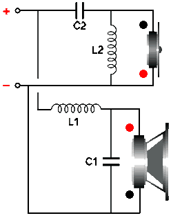 Les deux entrées sont cours-circuitées par un pontage lors de l'achat et un seul cable de l'ampli vers l'enceinte suffit. Cette connection normale suffit pour les gens normaux. Il n'y a aucune raison d'utiliser du bi-wiring, sauf si vous voulez payer deux fois vos chers cables en cuivre oxygen free 99.995%. Le bi-amping est très interessant, surtout pour un amplificateur à lampes qui a généralement une puissance moindre. Le bi-amping permet de réduire la distorsion d'untermodulation (toujours présente avec des amplificateurs à lampes) et on dispose d'une puissance sonore qui est plus élevée que la puissance des deux amplis combinés. Le premier filtre qui est montré est un crossover standard qui est utilisé dans beaucoup d'enceintes (parfois en une version plus simple). Ce filtre se trouve dans l'enceinte même et sépare les basses des aiguës pour les envoyer aux haut parleurs correspondants. Il y a parfois une résistance qui est placée en série avec le tweeter pour égaliser les niveaux sonores. Le passage des basses aux aigues et progressif et il y a peu de déphasages à la fréquence de coupure. Le tweeter est branché à l'envers, c'est parce que le condensateur produit un déphasage avant de 90° et que la self produit un déphasage arrière de 90°. En tout on a alors un déphasage de 180° et c'est pour cela qu'un des deux haut parleurs est branché à l'envers. On aurait tout aussi bien pu inverser les connections du woofer, c'est simplement une convention. On ne peut pas utiliser une enceinte dont le tweeter est branché inversément et l'autre enceinte dont le woofer est branché inversément. C'est pour cela qu'il y a cette convention. Les enceintes avec un filtre très simple (un condensateur pour le tweeter) n'ont pas cette inversion. Il existe aussi un filtre série, montré ici dans une configuration du troisième ordre. L'ordre indique le nombre de composants filtrants par haut parleur dans le crossover. Le calcul des filtres de crossover est complexe car le haut parleur ne se comporte pas comme une simple résistance. Il faut prendre en compte la fréquence de résonnance du haut parleur, et cette fréquence change quand le haut parleur est placé dans l'enceinte. Une combinaison de filtres et de haut parleurs qui sonne très bien dans une enceinte donnée peut produire un mauvais son dans une autre enceinte qui charge différemment les haut parleurs et produit d'autres fréquences de résonnance. Je dispose de nombreux appareils de mesure pour tester les amplificateurs (générateurs multi fonctions, oscilloscope, distorsiomètre pour analyser les harmoniques,...) mais je n'ai rien pour tester les enceintes (pour commencer il faut un local adapté que je n'ai pas). Les enceintes qui ont deux entrées pour le bi wiring ou bi amping ne peuvent pas utiliser un filtre crossover série. Certains concepteurs préfèrent un filtre série, d'autres un filtre parallèle. Moi je préfère la configuration bi ampli où le filtrage s'effectue dans l'ampli même: pas de résonnances parasites, pas d'impédances changeantes et le filtre qui peut être calculé plus simplement. Dans un bi ampli, un filtre de 6dB par octave suffit généralement.