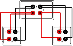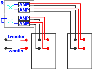 Puis j'ai branché un bi-ampli sur les enceintes. Comme il s'agit d'un ampli à lampes, c'est une boite énorme avec 8 tubes de puissance (4 EL504 pour les basses pour une puissance de 20W et 4 EL508 pour les mid/aiguës pour 10W). Le son était nettement meilleur, l'intermodulation avait pratiquement disparu, mais les basses n'étaient toujours pas en ordre. Trop envahissantes et mal définies. J'ai ouvert l'enceinte et j'ai éliminé le filtre. J'ai également remarqué pourquoi les basses étaient si mal définies: les deux woofers étaient branchés en parallèle et l'impédance faisait moins de 4Ω. L'ampli à lampes avec son facteur d'amortissement pas très élevé ne pouvait pas maitriser les woofers. La configuration finale était celle-ci: deux amplis stéréo (bi amping) et les deux enceintes utilisées sans filtres passe-haut et passe-bas (le filtrage se fait maintenant à l'entrée de l'ampli). Les woofers ont été branché sur la sortie 4Ω et les tweeters sur la sortie 8Ω. Les basses sont maintenant bien mieux amorties (les basses bien profondes apparaissent enfin).