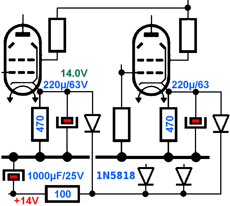 La triode de ce tube a un gain un peu plus faible que celui de la triode d'un PLC86 ou d'une triode combinée ECC83. Cela ne joue aucun role tant qu'on n'ajoute pas de contre-réaction: les sources actuelles ont une amplitude élevée et l'amplification totale est suffisante pour commander le haut parleur à sa puissance maximale. Mais quand on veut ajouter une contre-réaction (ce qui est recommandé avec une paire de PCL805), le gain total devient trop faible. Que faire? Ajouter une triode ECC83? C'est une possibilité, un seul tube suffit pour les deux canaux. C'est d'ailleurs la solution qui aurait été utilisée même après l'arrivée sur le marché des transistors, car les transistors de l'époque étaient plus chers et avaient de moins bonnes caractéristiques que les tubes qu'ils étaient sensés remplacer. Ah, les transistors OC70... le seul avantage qu'ils avaient, c'était qu'ils étaient fabriqués avec un boitier plastique transparent peint. Il suffisait de gratter la couleur noire pour avoir un photo-transistor. Courant maximum de 50mA, gain en courant de 30×, dissipation maximale de 125mW... Et le comble, c'est que le même transistor était vendu dix fois plus cher comme photo-transistor sans couleur noire! (OCP70) Pour un pramplificateur, il est plus interessant d'utiliser un a-op ou quelques transistors. Ce circuit est alimenté par la tension négative de polarisation des tubes de puissance (-30V). Il est recommandé de prévoir un filtrage supplémentaire (cellule de 1kΩ et 1000µF). La référence de cet ampli est la tension positive qui doit être la masse. Cet amplificateur a un gain de 10X et permet un signal en sortie de 21Vpp (7.45Vrms). S'il vous faut un gain plus élevé ou plus faible, ajoutez une résistance et un condensateur de découplage sur l'émetteur du premier transistor. Pour avoir un gain de 5X, ajoutez en parallèle sur la résistance de 15kΩ une seconde résistance de 15kΩ avec un condensateur de 10µF en série. Pour un gain de 20X, ajoutez une résistance de 1.5kΩ en parallèle sur la résistance de 1.5kΩ avec un condensateur de 100µF. Le choix des transistors est étendu: BC157 ou BC557 (A, B ou C) pour le premier étage et BC148 ou BC548 (A, B ou C) pour le second étage. Le gain en courant des transistors n'a que peu d'influence à cause de la contre réaction continue. L'impédance de sortie est assez élevée (et asymmétrique!) et ne peut servir que pour commander une triode avec résistance de grille supérieure à 150k ou un potentiomètre de 1MΩ.. La première triode d'un ampli peut également être remplacée par un transistor, mais la tension de sortie doit faire au minimum 10V effectifs (30Vpp) et de préférence 20V. Ce transistor doit être alimenté avec du 100V au minimum. Un transistor qui donne de bons résultats est le BF422 (tension maximale de 250V). Attention, cet étage reçoit généralement le signal à amplifier sur la grille (ou base) et la contre réaction sur la cathode (émetteur). Le préamplificateur montré ci-dessus est idéal pour augmenter l'amplitude du signal dans le cas d'un petit amplificateur standard avec un ECC83 et deux EL84 (préampli, déphaseur cathodyne et étage de puissance) ou des tubes équivalents comme les ECL86 ou PCL805. Le gain total peut être trop faible si on ajoute une contre-réaction. Dans le cas d'un amplificateur plus puissant, équipé de tubes EL34 ou EL509 on utilise un circuit plus complexe (genre Williamson) qui a un gain plus élevé. Un préampli n'est alors pas nécessaire. Un circuit un peu différent est présenté plus bas. Il a une impédance de sortie plus basse et peut être utilisé pour commander un réglage de tonalité qui nécessite une impédance plus basse. L'alimentation de ce circuit provient de la tension de chauffage des tubes qui est redressée et filtrée par un électrochimique de 1000µF au moins, ce qui nous fournit une tension continue de 8V. La consommation est de 1.5mA. La tension aux collecteur du PNP doit être d'environ 4V. La référence de cet ampli est la tension négative, l'ampli doit donc être alimenté par une tension positive contrairement au premier préampli. L'amplitude maximale du signal en sortie est de 2V effectifs et le gain est d'environ 10×. La modification du gain se fait par remplacement de la résistance de 1k: prenez une valeur de 2k pour un gain de 5× et 510Ω pour un gain de 20×. Le choix des transistors n'est pas critique, prenez des transistors de gain moyen (hfe = 100 - 250). Vous pouvez également utiliser des transistors à faible bruit de fond (BC549B et BC559B). On peut remplacer les triodes d'un ampli par des transistors, si on adapte le schéma. Le schéma d'un montage avec transistors se trouve ici. Le schéma à remplacer est un Williamson, mais on se rend vite compte que le montage à transistors est fort différent. Alimentation du préampliLe préampli consomme tout au plus quelques milliampères. Faut-il construire une alimentation spécifique? Nous avons déjà indiqué une possibilité: la tension négative pour la polarisaion des tubes de puissance où il faut simplement ajouter une cellule de filtrage supplémentaire. On peut également utiliser la tension de chauffage redressée, filtrée (et éventuellement doublée).Une autre possibilité c'est de prélever une tension positive sur les cathodes des tubes de puissance si la tension est de 12V ou plus. Voici l'alimentation d'un petit ampli avec ECL805. L'ampli utilise une polarisation par résistances cathodiques (courant de 30mA). Nous avons 4 résistances cathodiques (courant total de 120mA) pour 2 préamplis, c'est plus que suffisant. On peut éventuellement augmenter la valeurs des résistances à 510Ω si la tension anodique est de plus de 300V pour éviter de dépasser la dissipation anodique maximale. Pour réduire les pertes de tension dans les diodes on peut utiliser des diodes schottky (1N5818). Ces diodes ont une chute de tensio