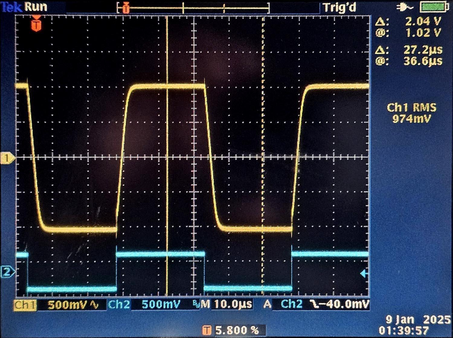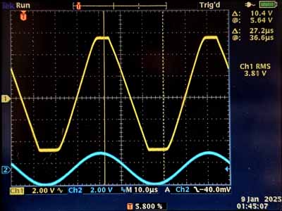 Utilisation d'un A-op (LM741)Il est parfois plus interessant d'utiliser un ampli opérationnel qui à cause de la contre réaction a une très faible impédance de sortie. L'ampli peut ainsi être utilisé pour attaquer un réglage de la tonalité. Même un vulgaire LM741 a de bonnes caractéristiques, il ne faut pas nécessairement utiliser un ampli spécialement destiné aux applications audio comme le LM833. Un LM833 est idéal quand il s'agit d'amplifier de très faibles signaux. Pour un peu augmenter le niveau, un LM741 suffit amplement.Utiliser un ampli opérationnel a comme avantage qu'il a un slew rate limité (de 0.5V/µs pour un LM741) et symmétrique. Le signal en crénaux a une fréquence de 10kHz et de tels signaux n'existent pas dans la nature. L'a-op limite ainsi automatiquement la bande passante à 500kHz. L'amplificateur n'a pas à reproduire des signaux que le transformateur de sortie ne peut de toute façon pas transmettre. Le vulgaire 741 dont on dit qu'il n'est pas adapté pour des applications audio peut être utilisé pour lisser le signal d'un pick up. Le bruit de fond est causé par de fines poussières qui produisent des pics de tension intenses mais très courts. La bande passante (slew rate) limitée d'un 741 permet de filtrer ces pics de tension tout en laissant passer le message sonore. La réduction de la bande passante par le slew rate limité est plus effectif qu'une limitation classique de la bande passante par un petit condensateur, qui ne produit qu'une réduction de 6dB par octave. Mais le LM741 a aussi des inconvénients, causés par le fait que cet ampli n'a jamais été conçu pour des applications audio. A certaines amplitudes et fréquences on voit apparaitres des distorsions de croisement asymmétriques (image d'oscilloscope: 20kHz, 500mVpp in, amplification 4×). La distorsion dépend de la production. Comme il s'agit d'un défaut à la conception, l'anomalie peut être plus ou moins présente. Et naturellement un a-op (ou tout amplificateur à transistors) produit un écrètage affreux (clipping) dès que l'amplitude maximale est atteinte (ici: signal de 3Vpp en entrée, clipping à 10Vpp et tension d'alimentation de 13V. Un tel préampli ne pourra jamais être utilisé dans un préampli de guitare (avant le réglage du volume), car le préampli doit être surchargé (overload) pour arriver au son typique des guitares électriques. Par contre le circuit peut être utilisé pour chasser les rats. |