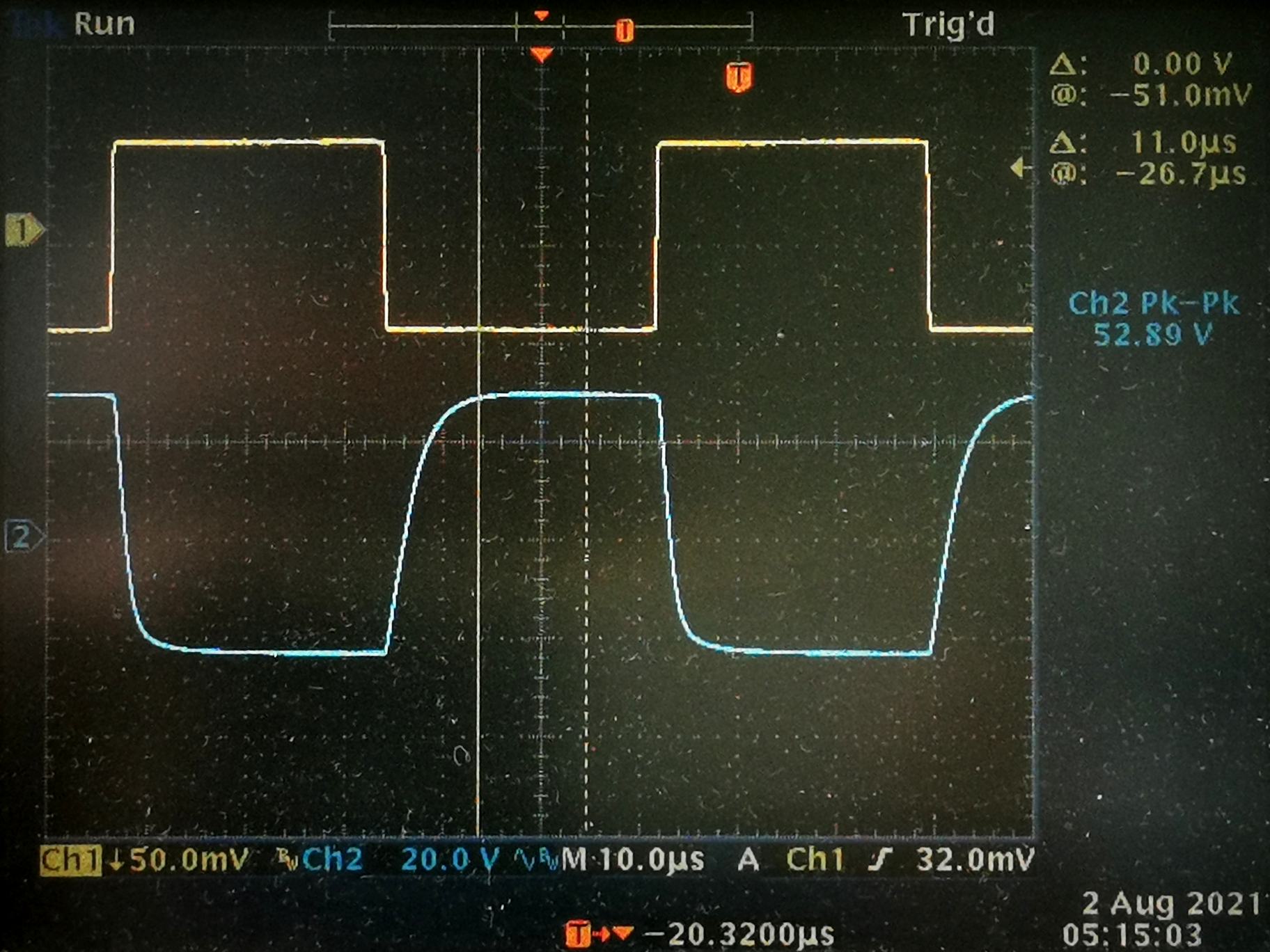 Les flancs qui ne sont pas verticaux, c'est en fait la courbe caractéristique de la charge d'un condensateur par une résistance de valeur non-nulle. Le condensateur étant ici la grille du tube de puissance.