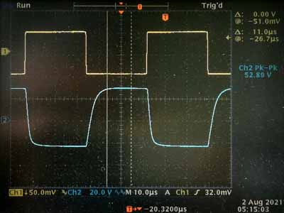 Amplification d'un signal carré 18kHz, charge de 10pF. Le signal à l'entrée est de 100mV, le signal en sortie de 52.9V, soit un gain de 54dB. Avec une charge de 180pF l'amplitude est réduite de 20% et les flancs sont encore moins raides. La valeur de 180pF est la capacité calculée (capacitance de Miller) par effet de l'anode sur la grille avec un EL509.