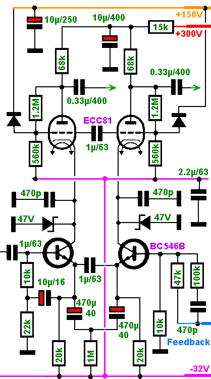 Chaque circuit reçoit des améliorations, le schéma a une modification de la tension de polarisation des grilles des triodes qui augmente la stabilité du montage (modification que les autres schémas n'ont pas). La tension de polarisation est prélevée de la tension négative (qui est ici de -6.3V). Cette amélioration réduit l'influence d'une variation de la tension d'alimentation négative (la modification n'est pas nécessaire si la tension est stable). Quand cette tension devient plus négative, le courant dans le transistor augmente. La triode reçoit un courant plus important, ce qui fait chuter la tension sur l'anode. En réduisant la tension sur la grille de commande, on contrecarre l'augmentation du courant dans la triode. Cette amélioration peut également être inclue dans les autres montages si on adapte la valeur des deux résistances.