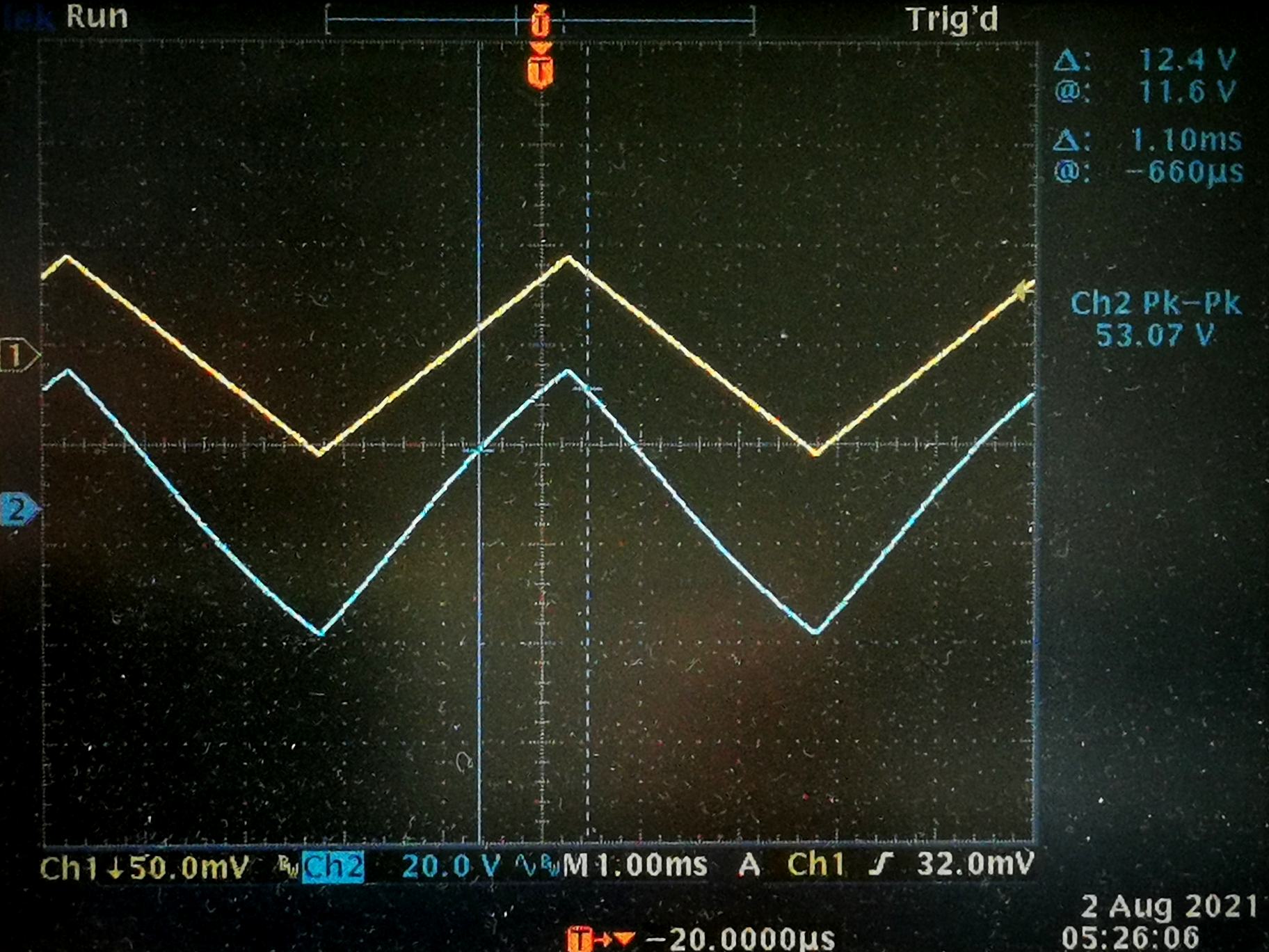 Un amplificateur peut sembler parfait avec un signal en crénaux ou un signal sinusoïdal, mais c'est la reproduction d'un signal triangulaire qui fait le mieux apparaitre les défauts. On voit que l'amplificateur s'essoufle en fin de parcours (la droite se courbe).