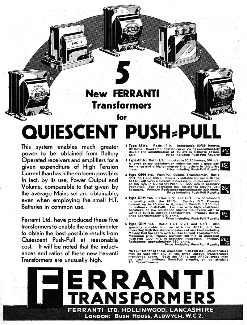 La composante radiofréquences est éliminée par le condensateur et le signal va au primaire du premier transfo qui va créer les deux phases et légèrement augmenter l'amplitude du signal. L'amplificateur de puissance est un push pull réduit à sa plus simple expression. On utilise une polarisation négative. La batterie C avait plusieurs connections et il fallait choisir une connection qui donne environ 11.3V (donc 7 ou 8 éléments) pour avoir un fonctionnement très proche de la classe B. Les revues de l'époque disaient que l'écoute était "acceptable". Il est vrai que la qualité sonore d'un récepteur, même alimenté sur secteur n'était pas très élevée. La plupart des haut parleurs étaient électrodynamiques (donc avec bobine supplémentaire pour créer le champ magnétique car les aimants de l'époque n'étaient pas fameux). Les appareils sur batterie n'avaient pas cette bobine et devaient donc utiliser des aimants dont le champ magnétique était moindre. Le son ainsi produit était faible et de mauvaise qualité. On n'a pas tellement écouté la radio pendant la guerre, mais plutot le bruit des bombes. Après la guerre on a directement abandonné le montage quiescent push pull. On avait maintenant des aimants plus puissants permettant de produire un volume sonore plus important avec une puissance moindre. L'utilisation du push pull a été abandonné dans les radios au profit d'un montage single ended qui était jugé suffisant. Si les radios d'avant guerre fonctionnaient sur batteries, c'était contraint et forcé parce qu'il n'y avait pas de secteur. Après la guerre les radios sur piles deviennent si pas portatives, du moins portables. |
