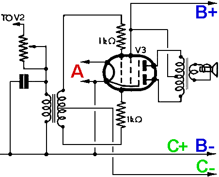 Comme tous les tubes pour fonctionnement sur batteries la double pentode est à chauffage direct (0.3A). Voici un schéma standard de la partie audio d'un récepteur de cette époque. C'étaient des récepteurs fabriqués individuellement ou en très petites séries.