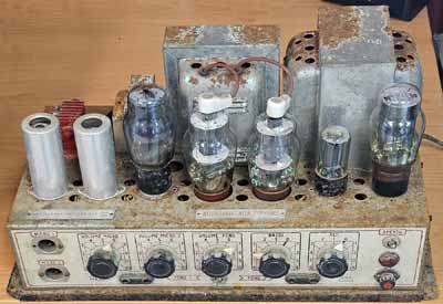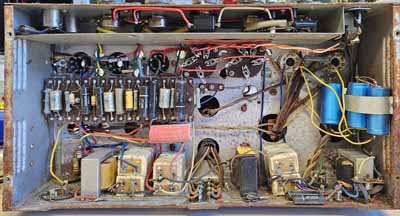Un exemple pratique: restaurer ou réparerA droite un amplificateur de Geloso. L'amplificateur était utilisé dans les salles de cinéma (son optique), mais on pouvait également brancher deux microphones. L'amplificateur utilise des condensateurs électrochimiques rectangulaires qui doivent tous être remplacés.Le premier tube préamplificateur est un 12SL7GT utilisé pour l'amplification des deux microphones. Ce tube peut éventuellement être éliminé. Le second tube préamplificateur est un amplificateur en tension et la seconde triode sert pour le controle de tonalité. Ce tube ne peut pas être éliminé. Le troisième tube est un 6L6GT qui est utilisé comme tube d'attaque des tubes de puissance, via un transformateur déphaseur. Les tubes de puissance sont des 807 qu'on reconnait au téton anodique. Le 5Y3 est le redresseur pour la tension anodique de tout l'ampli (300V), sans la tension anodique des tubes de puissance. Le 5R4GY est le redresseur pour la tension anodique des 807 (690V). Est-ce que cela vaut la peine de réparer cet ampli? Ce serait dommage de le perdre, mais sachez que ce n'est pas un ampli haute fidélité et qu'il travaille en mono. Ici deux solutions s'ouvent à vous: