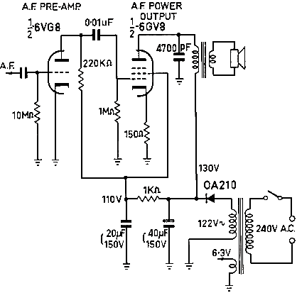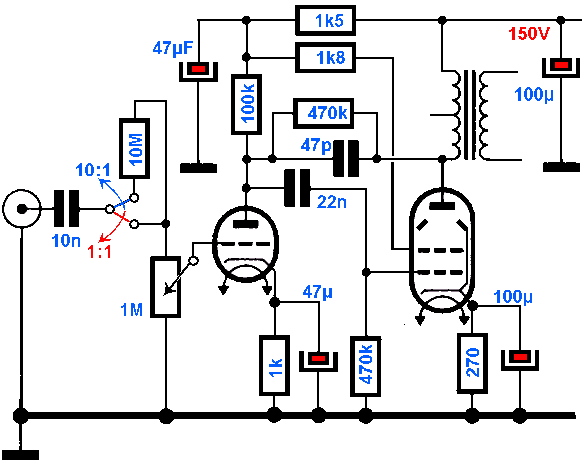 Il y avait souvent une diode qui pouvait être mise en fonction dans la sonde, ceci pour tester les récepteurs. les amplificateurs étaient faciles à controler, mais c'était plus difficiloe pour les récepteurs. La diode permettait de détecter les signaux radio AM. La bande passante d'un signal tracer ne doit pas être étendue, l'appareil sert à controler la présence d'un signal, ce n'est pas un appareil hifi. Une bande passante de 200 à 6000Hz est suffisante. Si vous avez une ancienne sonde d'oscilloscope, vous pouvez également l'utiliser pour le signal tracer. Certaines sondes ont un atténuateur incorporé, ce qui peut être utile si on mesure des signaux à l'étage de puissance. On peut utiliser une enceinte active d'un ordinateur comme signal tracer (un seul canal suffit) ou bien fabriquer quelque chose avec un LM386, mais cela ne se fait pas, voyons! Le montage à droite est un petit ampli single ended avec un 6GV8, l'équivalent américain de notre ECL805. Le circuit était utilisé dans une radio à réception directe. Cette lampe fonctionne très bien avec une haute tension un peu limitée. La résistance cathodique n'est pas découplée et la puissance audio est de 1.4W. Avec un condensateur de 50µF la puissance monte à 2.2W (d = 11%). La sensibilité est moindre qu'avec un ECL86 (un tube destiné spécialement aux applications audio) mais cela ne dérange pas car il n'y a pas de contre réaction. Les signaux qui seront mesurés ont une amplitude suffisante. S'il faut une contre réaction, le plus simple est de placer une résistance de 470kΩ entre l'anode de la triode et celle de la tétrode. Cette contre réaction ne passe pas par le transfo (qui peut provoquer des déphasages) et la contre réaction ne rend pas le montage instable. Le signal tracer peut être fabriqué tel quel, mais on utilise de préférence un redresseur en pont au lieu d'une simple diode OA210. On peut augmenter la valeur des condensateurs à 100 + 100µF. Le transfo doit fournir du 110V, ce qui donne 150V redressé. Les redresseurs en pont ont une chute de tension plus faible et les transfos un meilleur rendement avec un redresseur en pont au lieu d'un redresseur simple alternance. Le choix de la lampe amplificatrice est énorme et vous pouvez utiliser ce que vous avez en stock (hélas le brochage n'est jamais compatible).