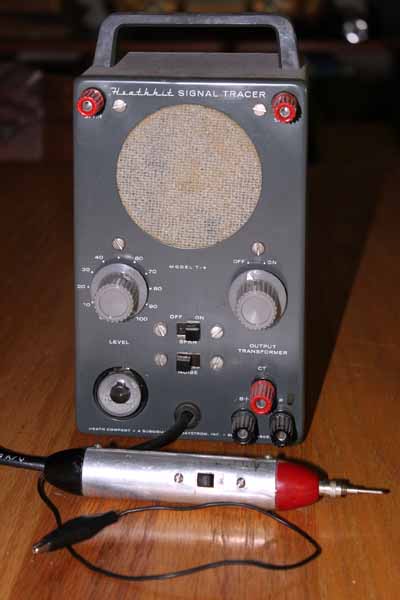 | Un signal tracer est un petit amplificateur pour suivre la progression d'un signal audio dans un récepteur ou un amplificateur. |