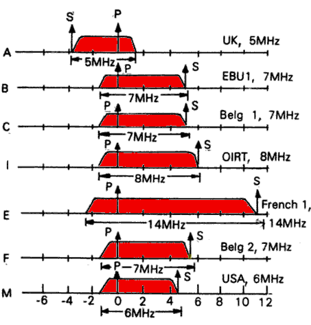 Il y a même eu un début de panique en France, les Alsaciens achetant massivement des téléviseurs en 625 lignes (pour capter l'ARD allemande) et délaissaient les 819 lignes. La norme 819 ligne nécessitait une bande passante double de celle de la norme 625 lignes (14MHz au lieu de 7MHz). La norme n'utilisait que la bande VHF-III, la bande VHF-I étant trop étroite. Le canal son, modulé en amplitude était très sensible aux parasites et pour éviter les interférences, il fallait en plus placer la porteuse son d'un canal donné (par exemple celle du canal F10) entre deux canaux (en l'occurence le canal F7 et F9). Le seul moyen pour y arriver, c'était d'inverser la place de la porteuse son par rapport à la porteuse image: la fréquence son est placée sous la fréquence image pour les canaux pairs et l'inverse pour les canaux impairs.(SC = sound carrier, PC = picture carrier). Cela n'avait pas de conséquences pour les tout premiers téléviseurs, qui de toute façon ne pouvaient recevoir qu'un canal. L'accord se faisait une fois pour toutes à l'usine. Plus tard quand les téléviseurs multicanaux sont apparus, la partie moyenne fréquence audio avait deux circuits accordés, un réglé sur la fréquence des canaux pairs et l'autre sur la fréquence des canaux impairs, éliminant d'un coup l'avantage que pouvait avoir le placement alterné de la porteuse son. La qualité de l'uimage n'était pas fameuse non plus, à cause du flanc de Nyquist qui se penchait alternativement d'un coté ou de l'autre de la porteuse image. Le français se croient très malin, mais le résultat pratique n'est vraiment pas à la hauteur... Remarquez en plus l'étrange placement du canal F8a de l'émetteur de Lille, lancé à grande hâte (pour éviter que les français du Nord ne se rabattent sur les émissions belges de l'INR). Cet émetteur a été mis en fonction avant la standardisation des canaux; Avec l'apparition des tuners à sélecteur rotatif, il était devenu possible d'avoir la fréquence de l'oscillateur local située en dessous ou au dessus de la fréquence de l'émetteur, permettant de remettre la fréquence son à la bonne place pour les canaux pairs et impairs. Mais quelle complication! Plus tard, la France est également passée au système en 625 lignes contrainte et forcée pour la seconde chaine, la première chaine continuant à émettre en 819 lignes. Malgré leur forcing, les français ne sont pas arrivés à imposer leur norme à l'Europe et l'échange de programmes avec les autres pays était très compliqué. Les français étaient donc obligés d'acheter un téléviseur multinormes plus cher pour capter le second programme. La couleur qui allait bientôt apparaitre n'était pas réalisable en pratique en 819 lignes.
