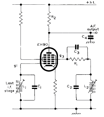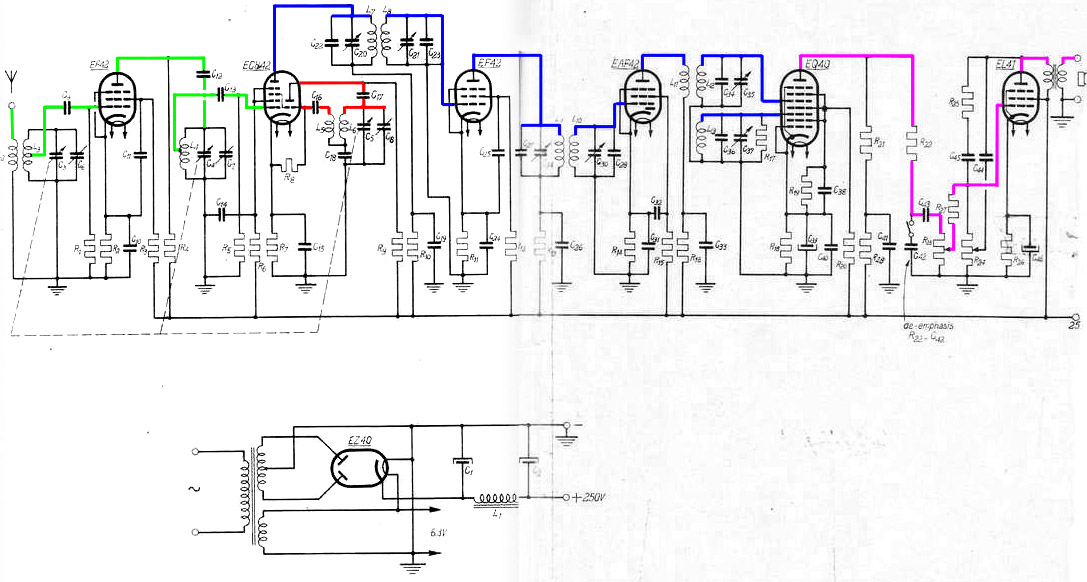 Pour les postes de radio, on est finalement passé au tube EABC80 combinant toutes les fonctions nécessaires dans un seul tube: une diode AM, deux diodes FM et un préamplificateur basse fréquence. Le nombre de commutations entre AM et FM était limité. La télévision utiisait les premières diodes au germanium. La déformation plus importante provoquée par ces diodes ne jouait pas un rôle important dans ces premiers téléviseurs.