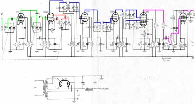Le tube de puissance est un ECL80, une triode-pentode de très faible puissance. Pour que le tube puisse travailler avec une tension de chauffage de 6.3V et un courant de 300mA il faut une seule cathode pour à la fois la triode et la pentode. Il faut alors chercher deux tensions négatives quelque part dans la télévision puisque la cathode est mise à la masse. Le tube ECL80 ne sera pas utilisé très longtemps dans les téléviseurs. |