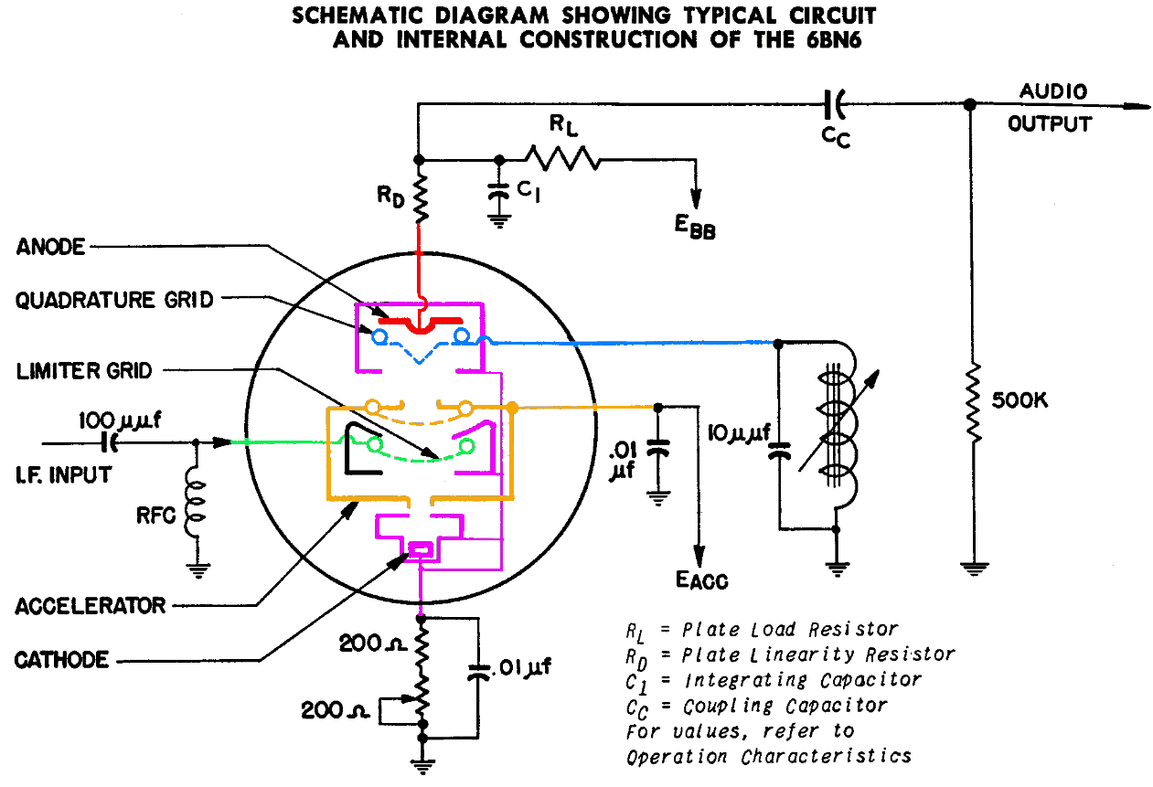 EH90Ce type de circuit est en pratique uniquement utilisé avec les téléviseurs, qui ne nécessitent qu'un démodulateur FM pour le son. En Grande Bretagne on utilise souvent des tubes avec soquet 7 briches (type "9"). Le signal moyenne fréquence 6MHz ou 5.5MHz arrive sur la première grille. Ce type de circuit était surtout utilisé en Angleterre qui utilise une porteuse son située à 6MHz de la porteuse image, c'est la norme CCIR I, tandis qu'en Europe continentale on utilise la norme CCIR B/G avec une fréquence intermédiaire de 5.5MHz. Un second circuit accordé est branché sur la troisième grille. La modulation du courant d'électrons par la première grille agit sur la troisième grille, dont le circuit accordé se met également à osciller sur la même fréquence. Le déphasage est de 90° et varie selon le changement de la fréquence. Les deux grilles de commande agissent ici aussi comme fonction AND et nous avons sur la plaque une série d'impulsions plus ou moins larges selon la fréquence. Ces impulsions sont lissées par le petit condensateur de sortie et nous obtenons un signal audio basse fréquence en sortie. Ce circuit plus simple nécessite une tension alternative assez élevée pour saturer le tube et permettre l'écrètage (élimination de la variation d'amplitude du signal MF), mais l'amplitude élevée du signal en sortie permet d'éviter la triode préamplificatrice. Système américain avec 6BN6Le but est ici également de réaliser un détecteur FM le plus simple possible (facile à régler) et fournissant un signal suffisamment puissant pour commander directement le tube de puissance. La fréquence intermédiaire audio est de 4.5MHz et le principe de l'interporteuse est d'application. Ce tube sera également utilisé plus tard dans les récepteurs FM. La construction du tube est assez speciale pour avoir la même réponse sur la grille 1 ("limiter grid") et la grille 4 ("quadrature grid"). Un signal alternatif de 2V ou plus centré sur le 0V permet de passer du cut off (pas de signal sur l'anode) à la saturation (courant maximal sur l'anode). Une augmentation de la tension sur la grille ne fait plus augmenter le courant anodique, le tube travaille en limiteur. Le même signal sur la grille 1 ou 4 produit le même effet: le tube fonctionne en multiplicateur logique.