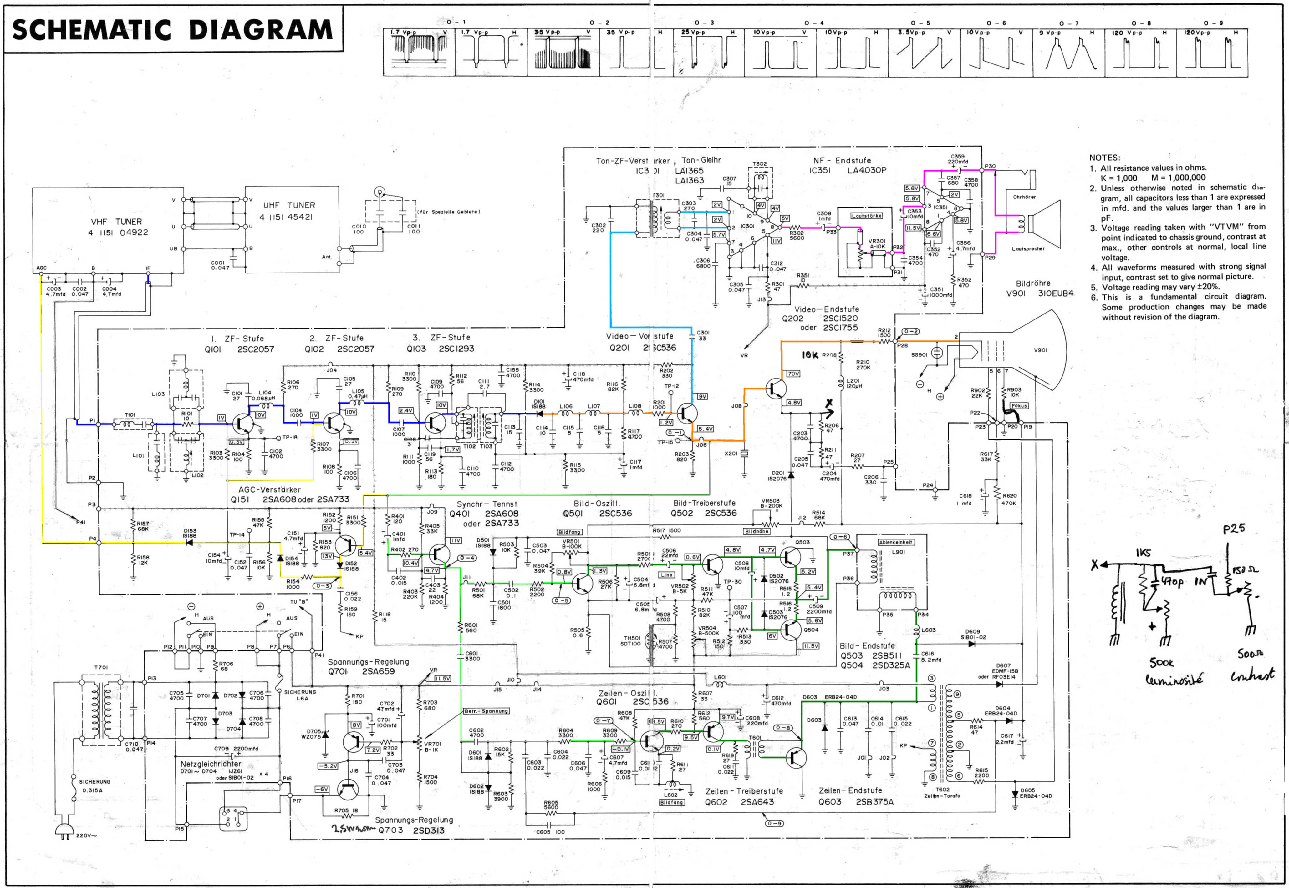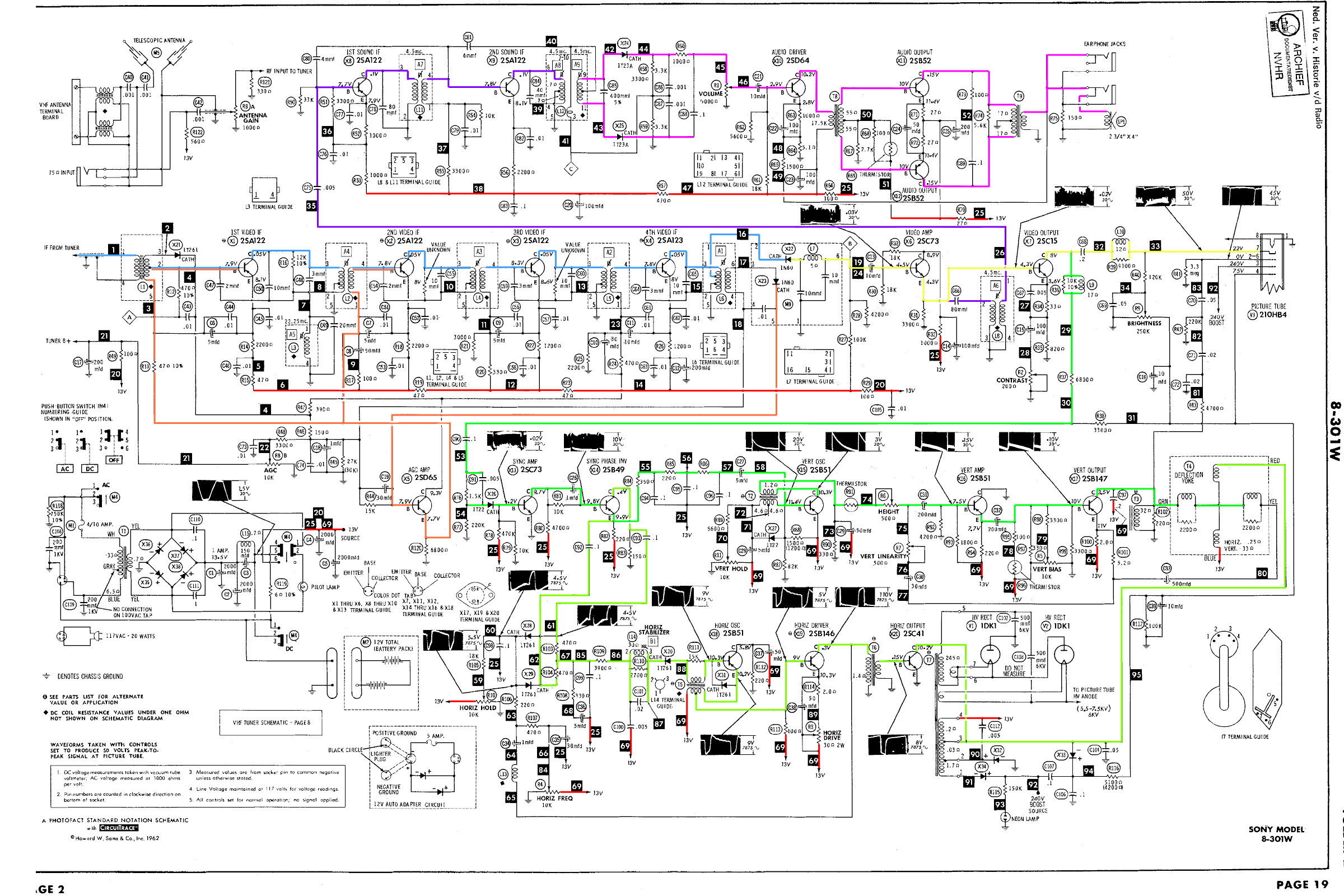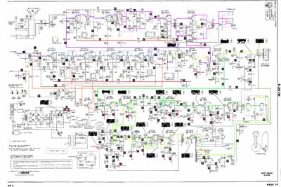 Il y a 4 étages moyenne fréquence pour l'image (autant que dans les premiers téléviseurs à lampes). Puis il y a la détection et deux étages vidéo. Il n'y a pas de référence nu niveau du noir: quand une scène foncée doit être reproduire, elle apparait comme une scène très peu contrastée. L'étage de déflection ligne fournit également la haute tension pour le tube-image. Le premier étage vidéo amplifie également le signal FM audio, qui passe ensuite par deux étages moyenne fréquence. Bien que la télé utilise les même transistors que pour l'image, on utilise ici la neutrodynisation, alors que la fréquence est plus basse (5.5MHz au lieu de 30MHz). La raison est que la bande passante en FM est plus étroite que pour l'image, et sans neutrodyne on aurait une bande passante asymmétrique. La bande passante est plus large pour la moyenne fréquence image et un défaut de symmétrie ne se remarque pas. Il y a un descriminateur FM simple suivi d'une amplification son composée de trois transistors. Lors de la détection du signal vidéo, il apparait également une composante continue qui est utilisée pour la commande du gain. La norme B/G (modulation négative) permet un circuit très simple qui ne doirt détecter que les pics de synchronisation dont l'amplitude doit être constante. Les deux premiers étages moyenne fréquence ont un controle automatique du volume, tandis que le premier étage a en plus un circuit d'ammortissement quand le signal est trop fort. Contrairement à la norme francaise, le son en FM ne nécessite pas de controle automatique du volume. La déflection de trame utilise un circuit standard, mais pas d'étage push pull, les transistors complémentaires n'existaient pas encore. Il y a un econtre-réaction pour augmenter la linéarité. L'étage de ligne utilise un oscillateur dont la fréquence est réglée par comparaison de sa fréquence avec celle des tops de synchronisation. Ce système qui est principalement utilisé dans les télévisions à grand écran permet une image plus stable. La haute tension est produite par un doubleur de tension équipé de tubes diodes (en Europe on utilisait déja des diodes à semi-conducteurs sous forme de batonnets.