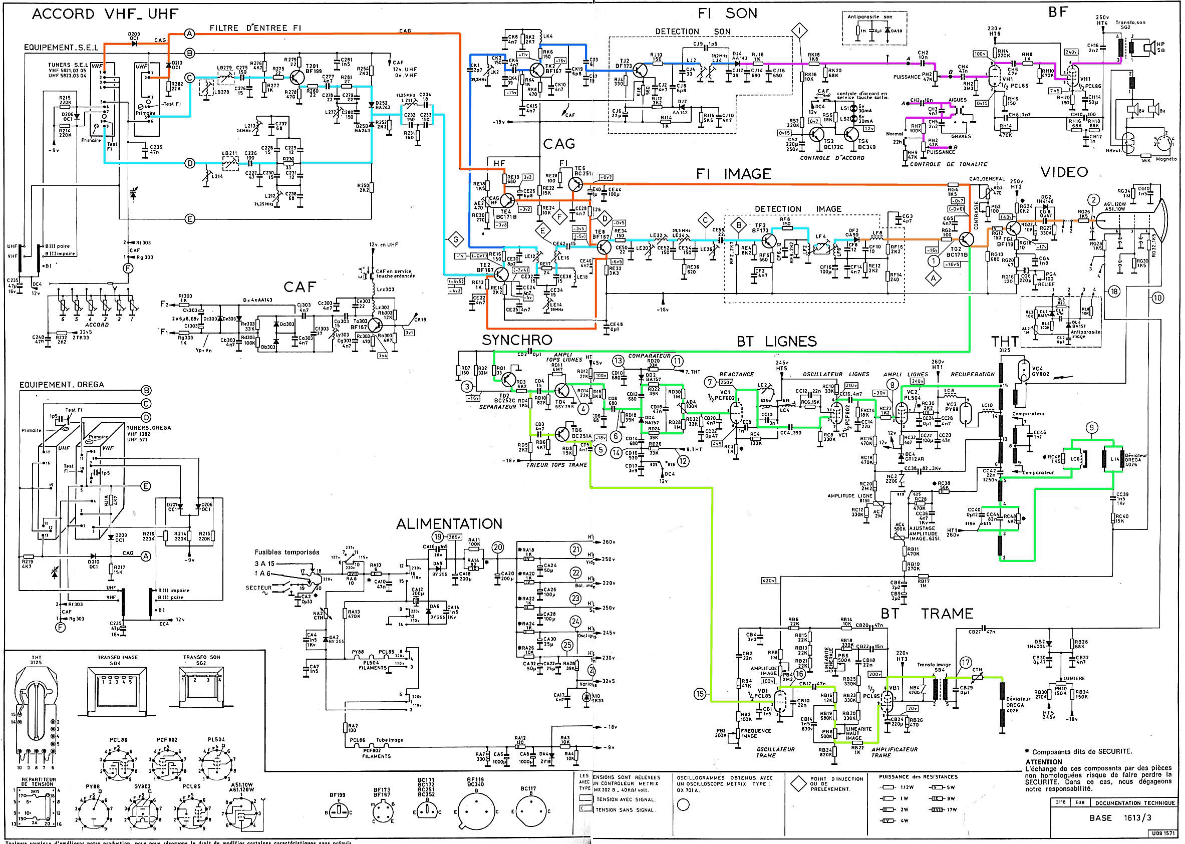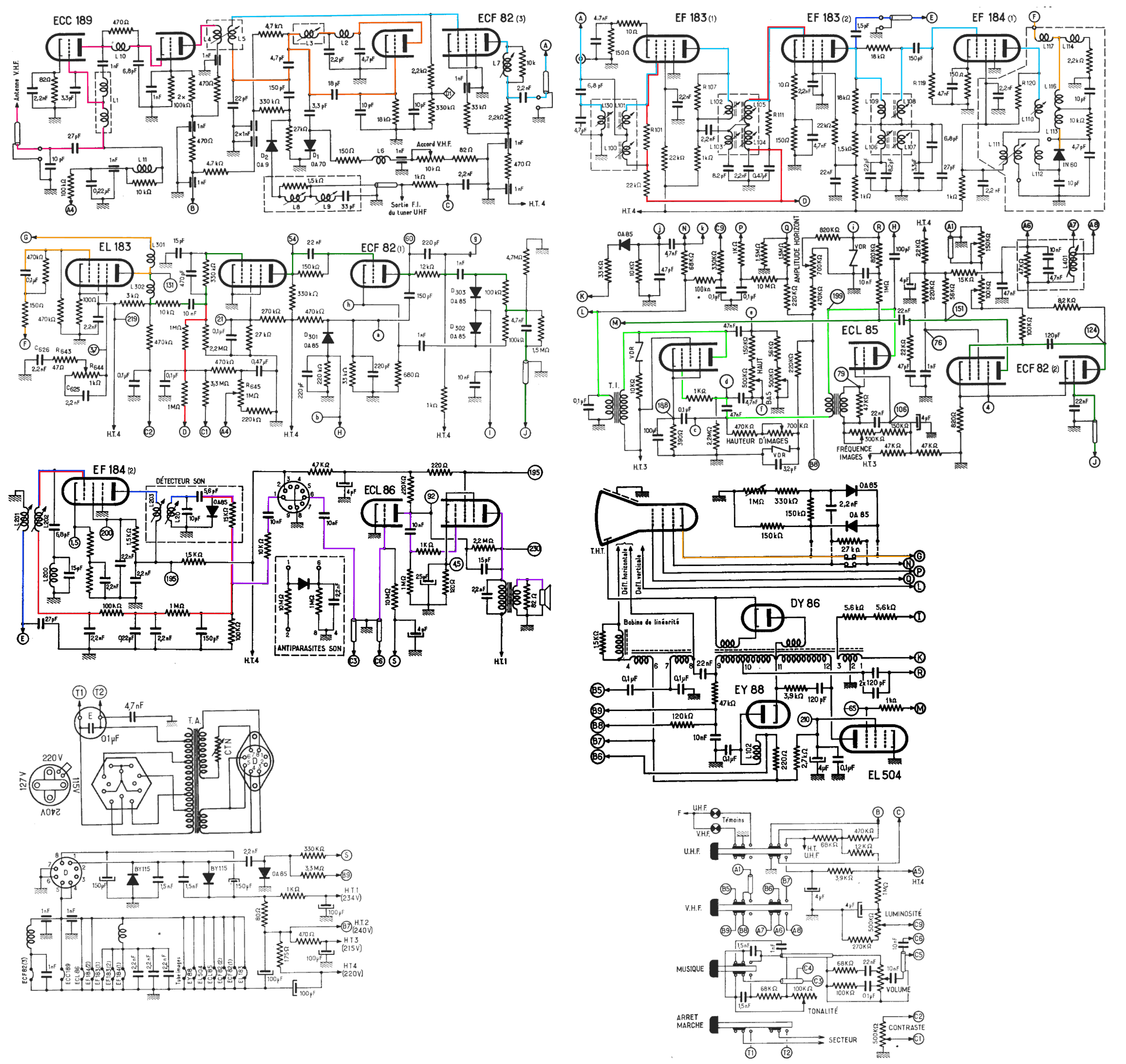 Alimentation éléctriqueLa partie puissance est équipée de tubes, tout le reste utilise des transistors. Le courant de chauffage des tubes permet d'alimenter toute la partie transistorisée en -18V et la tension sur la résistance cathodique du tube de balayage ligne permet d'alimenter le tuner en +12V: les transistors consomment donc nettement moins que les tubes.Il n'est pas possible de produire le +12V à partir de l'alternance positive du courant de chauffage des tubes, parce que celui-ci est redressé (le nombre de tubes est trop faible pour faire une chaine série de 300mA). En 220V on n'utilise qu'une alternance du secteur, c'est comme si la chaine série était alimentée en 110V La télevision peut travailler en 110 et 220V, en France il y avait encore des zones alimentées en 110V dans les années 1970. On utilise un doubleur de tension pour la haute tension quand le poste est alimenté en 110V. L'appareil a un tuner VHF et UHF suivi de 4 étages moyenne fréquence pour l'image et 4 étages pour le son (deux étages sont communs).