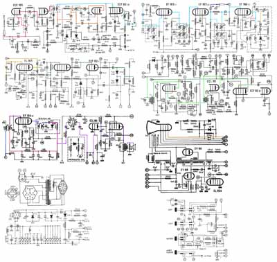 C'est un téléviseur qui utilise un transfo pour le chauffage (tous les tubes sont alimentés en 6.3V). Ils auraient donc tout aussi bien pu produire la haute tension via le primaire, au lieu d'avoir à utiliser un montage doubleur de tension nécessaire dans les régions alimentées en 110V. Nous avons un préamplificateur haute fréquence cascode sans présélecteur, ce qui donne une intermodulation importante s'il y a un émetteur puissant dans la bande VHF. Ce n'est pas un problème en pratique, puisque la télé ne peut recevoir qu'une seule chaine. Le tube ECF82 (plus connu en Europe sous le code PCF82) est utilisé comme oscillateur VHF (triode) et mélangeur (pentode). Nous avons ensuite trois étages moyenne fréquence avec des tubes EF183 (à pente variable et controle automatique du gain) et EF184 à pente fixe. Pour la partie vidéo, nous avons un EL183, une pentode de puissance vidéo. L'amplitude du signal vidéo fournit la tension négative pour le controle automatique du gain. Le signal vidéo de forte amplitude est appliqué à la grille du ECF82 et il se produit un redressement (la grille agissant comme diode). La documentation technique indique que ce système qui dépend du contenu de l'image n'est pas plus mauvais que le système indépendant du contenu de l'image (système européen qui utilise une modulation négative). Fait est que dans les télévisions plus élaborées on utilisera l'amplitude du porche (après les tops de synchronisation) pour déterminer l'amplification), mais ce système nécessite un circuit plus complexe. La séparation des tops de synchronisation est complexe avec la modulation positive et nécessite deux tubes ECF82. Le tube pour la déflection trame est un ECL805 et celui pour la déflection lignes un EL504. Le signal moyenne fréquence audio est prélevé après la troisième pentode moyenne fréquence (image) et passe par un EF184. Ce tube qui est à pente fixe reçoit malgré tout un signal de c.a.g. et permet une correction renforcée de l'amplitude du signal audio. Ici aussi on a un antiparasite son, bien nécessaire dans les téléviseurs français. A cause de la détection par une seule diode les parasites ont une impulsion négative uniquement. La diode du filtre est normalement en conduction et passe à l'état ouvert quand un parasite arrive. L'étage audio est classique avec un ECL86, un tube qui donne un bon volume sonore. Il y a également un antiparasite pour l'image car avec la modulation positive les parasites se voyent comme des points ou des trainées blanches. Ce circuit est basé sur le même principe que l'antiparasite son. Le dessin du schéma est typique des appareils français, avec les tubes dessinés à l'horizontale et une découpe du schéma en petits morceaux avec de nombreuses références et il faut chercher où va le signal. Le signal peut aussi bien aller de gauche à droite que de droite à gauche, tandis que les autres fabricants européens avaient tous repris le style de schéma Philips.