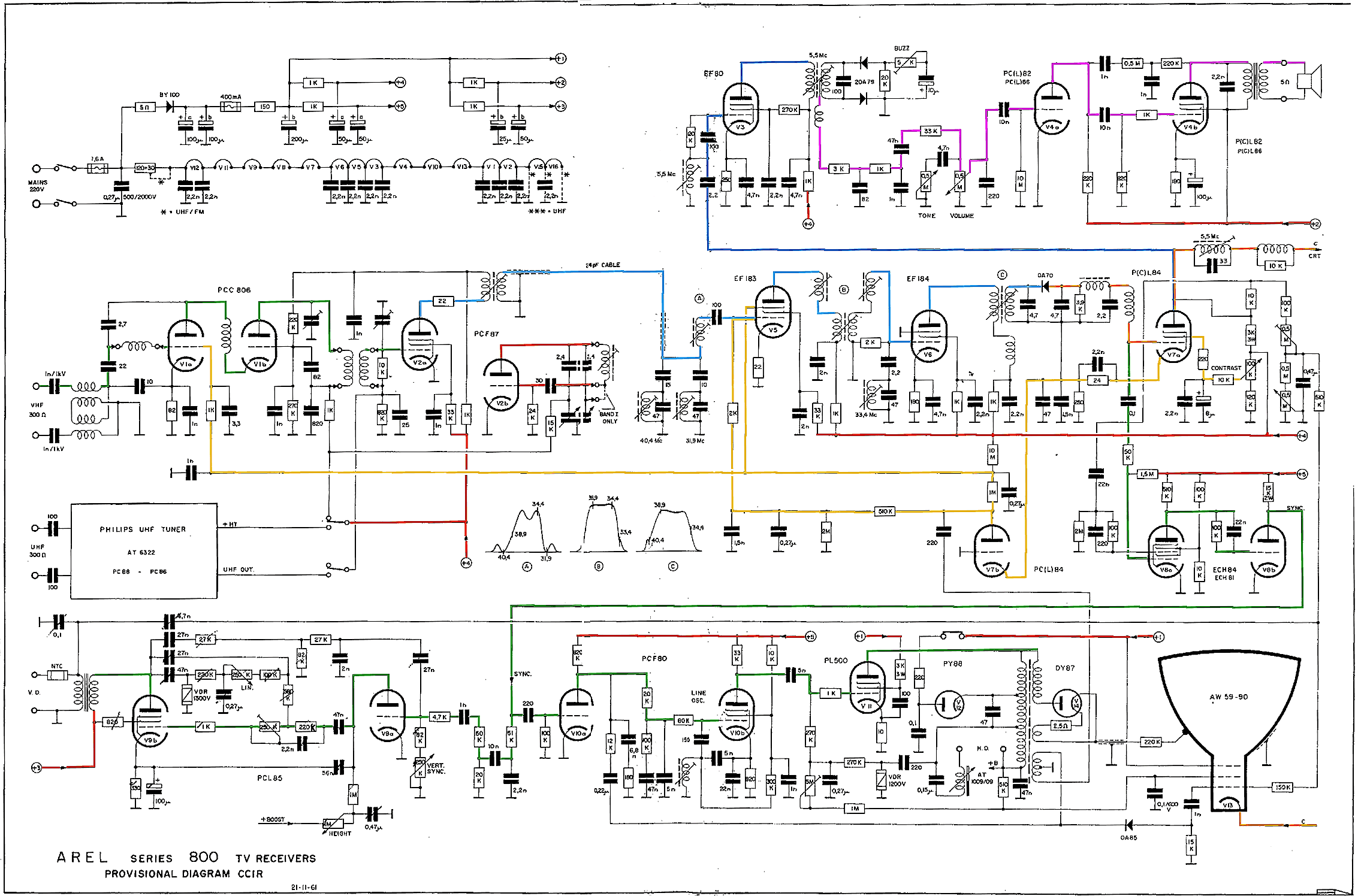 Arel Series 800 Nous commençons par un étage VHF composé d'un étage cascode PCC806 (c'est standard) suivi d'une triode-pentode PCF87. Pour la bande UHF, il est fait appel à un tuner de Philips. La télévision ne peut recevoir que les programmes locaux car l'appareil a trop peu d'étages moyenne fréquence: normalement il en faut quatre avec des pentodes normales (genre EF80) ou trois avec des pentodes modernes (PCF200/PCF201). Le téléviseur utilise deux tubes EF183 et EF184, ce sont des tubes à grille cadre très efficaces. Le premier est conçu pour la commande automatique du gain, le second tube a un gain élevé mais il n'est pas possible de réduire le gain. Pratiquement toutes les pentodes basse puissance avec un dernier chiffre impair sont conçues pour un réglage du gain. Pour le réglage du contraste, on utilise une commande sur la seconde grille du tube de sortie image (PCL84). Le courant plus ou moins élevé produit également une tension plus ou moins élevée sur la cathode, et cette tension est également utilisée pour la polarisation de certaines grilles. Il n'y a pas vraiment de controle automatique du gain, mais avec seulement deux étages moyenne fréquence ce n'est pas vraiment nécessaire. Le principe de l'interporteuse est utilisé pour le son, un étage moyenne fréquence équipé d'un EF80 et puis un tube pour l'amplification sonore (PCL82). Nous avons ensuite un séparateur de synchronisation ECH84, une partie trame PCL85 et ligne PCF80 suivi d'un PL500. Le schéma est plutôt un schéma de principe qu'un schéma effectif. Je me demande même si Arel a jamais fabriqué des téléviseurs. Arel était une petite marque enversoise établie juste après la seconde guerre mondiale qui fabriquait principalement des postes de radio. Arel a fusionné avec Novak, puis les deux marques ont disparu. D'autres marques belges sont Barco (qui existe encore) et Anex qui a survécu à l'apparition de la couleurs et produisait ses propres circuits. |