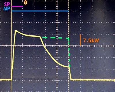 Le radar a une puissance de 30kW (qui est atteinte ici), mais la puissance diminue brusquement. Le radar fonctionne normalement en short pulse (SP: 0.05µs), mais est trop peu sensible en medium pulse (MP: 0.25µs) et totalement hors tolérance en long pulse (LP: 0.9µs, non indiqué ici).