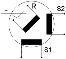 Résolveurs multipolairesLes résolveurs et synchros multipolaires ont deux séries de bobinages. Le premier système de bobinage correspond aux deux bobinages utilisés dans un résolveur classique, qui fournit un signal complet par rotation de 360°. La précision du signal est limitée à quelques degrés. Le second groupe de bobinages qui fournit par exemple 9, 18 ou 36 signaux complets par rotation de 360° a une précision accrue. Le premier groupe de bobinages est malgré tout nécessaire pour fournir une position absolue. On utilise soit un résolveur avec deux groupes de bobinages, soit deux résolveurs.Un asservissement utilise un commutateur qui transmet le signal du résolveur 1:1 tant que l'erreur est importante et puis passe au résolveur 1:36 pour obtenir une correction plus précise. |