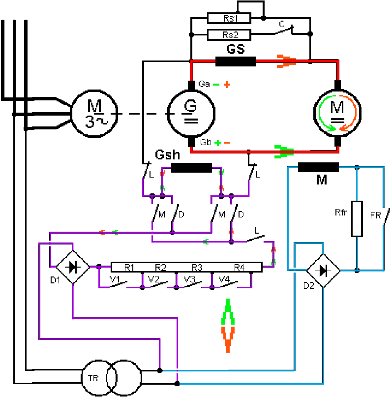 La dynamo G a une excitation série et parallèle (GS, partie en mauve et Gsh, partie en bleu). Le moteur à courant continu a une excitation indépendante M.