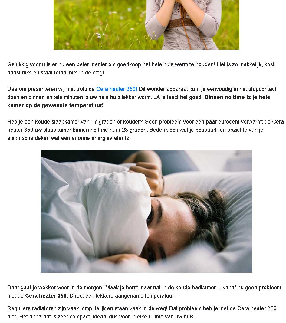 Une publicité pratiquement identique est utilisée sur un site néerlandais, et là ils exagèrent encore plus "Cet appareil extraordinaire chauffe toute la maison en quelques minutes!" Chauffer toute la maison avec 350W? Tu rèves, ou quoi? Il faut au moins une puissance 20× plus élevée pour chauffer une petite maison!