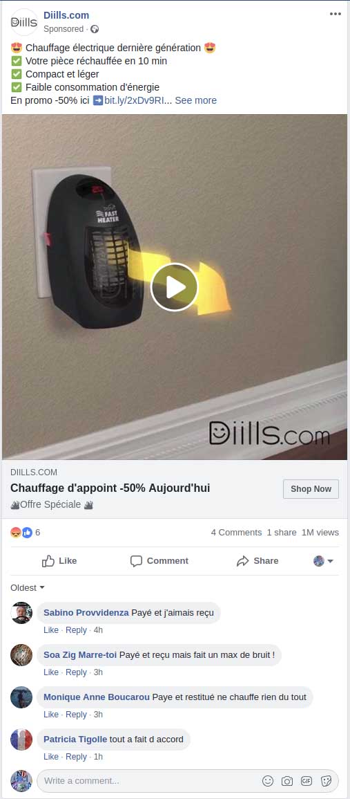 L'avantage de facebook, c'est qu'il est parfois possible de placer des commentaires. C'est pas toujours possible, peut-être que si les annonceurs payent plus ils peuvent bloquer les commentaires...