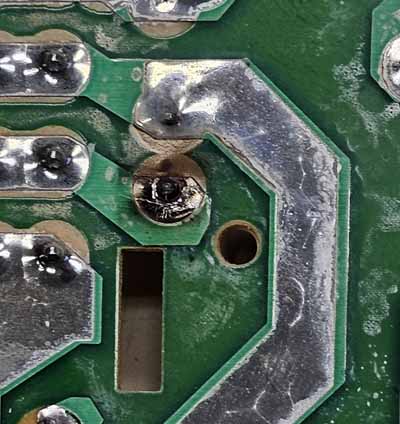 L'image à droite montre un contact au microswitch de porte qui est complètement grillé et ne fait plus contact. Il provient d'un four AEG et c'est une panne qui apparait régulièrement. Le symptome est qu'il n'y a plus de fonction micro-ondes. Selon la version, il n'y a pas non plus d'éclairage du four, de rotation du plateau ni de fonctionnement du ventilateur.