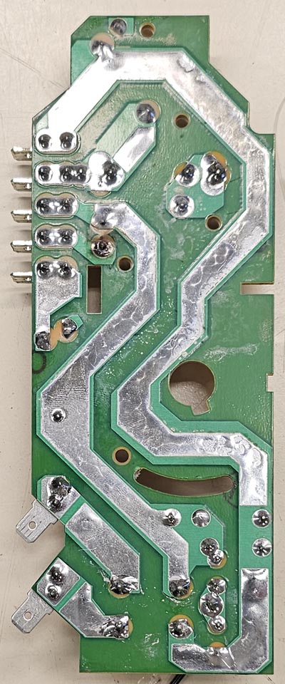 C'est normalement le secondaire qui entre en cours-circuit. Ici, il y a un cours-circuit intermittent au primaire. Le fil du chauffage a frotté contre le bobinage primaire et a usé l'émail à la longue. Sans isolant, il y a parfois un cours circuit qui se produit. On voit que le bobinage a noirci à l'endroit ou le fil du chauffage a frotté. Ce fil a un gros isolant en plastique plus résistant que l'émail du bobinage primaire. C'est alors le fusible de la maison qui saute (fusible rapide), pas le fusible de l'appareil, qui est un fusible lent).