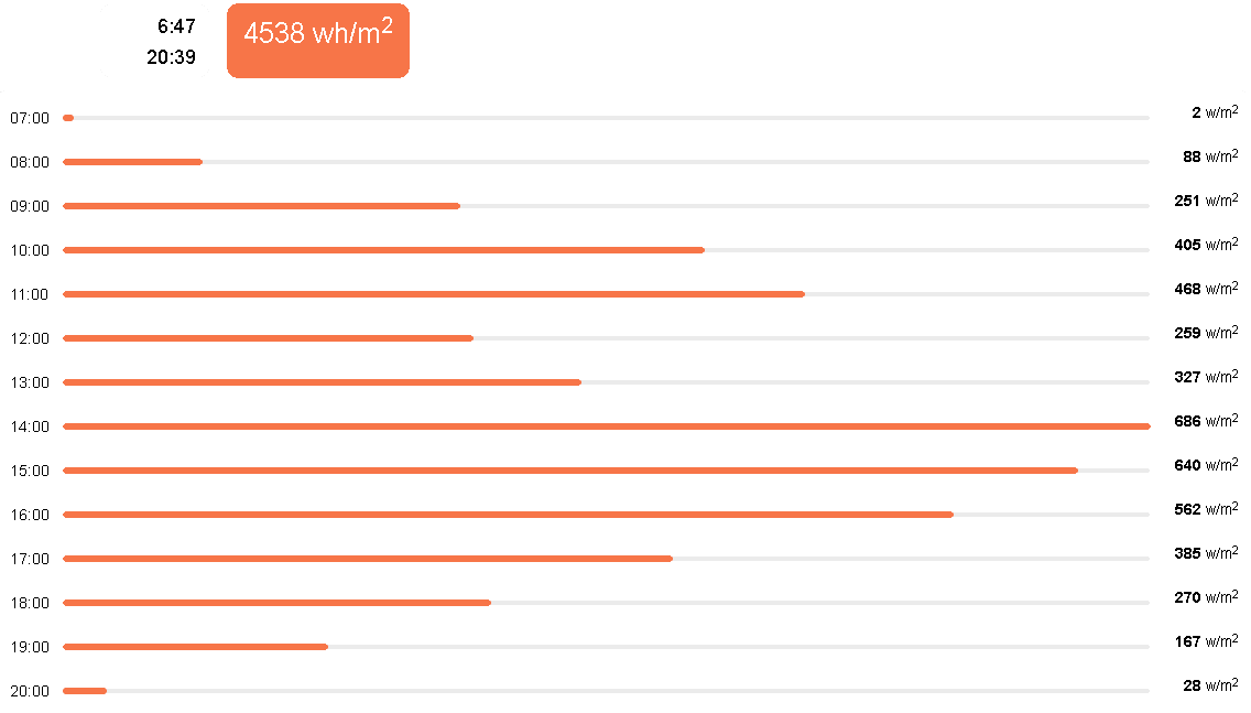 Le calcul de la puissanceSelon mon mode d'emploi le panneau de 98.3 × 45.3cm (= 4453cm2) devrait pouvoir fournir une puissance de 60W. C'est mesuré avec une illumination de 1000W par mètre carré, ce qui est beaucoup. Pendant une belle journée d'avril, nous avons une illumination maximale de 686W/m2 quand il y a du soleil, c'est environ les 2/3 de la puissance indiquée.  La puissance que le panneau peut fournir dans ce cas est un peu plus de 2/3 de la puissance indiquée, donc environ 40W. Cette puissance n'est atteinte que quand il y a du soleil, ce qui n'est pas fréquent en Belgique ni dans le Nord de la France où il pleut tout le temps (cfr. Bienvenue chez les ch'tis). A l'ombre le panneau produit une puissance de quelques watts. Cette puissance est faible pour maintenir un accu chargé quand il doit alimenter un frigobox en Belgique (le frigo consomme également la nuit). Un petit frigo comme le Dometic CDF-18 a une consommation moyenne de 10 à 15W, donc environ 300Wh par jour. Notre panneau peut fournir 400Wh par jour quand le solei est présent toute la journée. C'est possible dans le sud de la France, difficilement chez nous. Un panneau solaire n'est pas une source d'énergie facile à utiliser: la puissance fournie est très variable et dépend en plus de la charge. Le mode d'emploi reprend deux valeurs: le courant de cours circuit (4A) et la tension maximale (21V). Mais dans ces deux cas le panneau ne produit aucune puissance, car soit la tension est nulle, soit le courant est nul. Les valeurs utiles sont une tension de 16.9V et un courant de 3.55A qui nous donnent le rendement le plus élevé, mais le rendement dépend aussi de l'ensoleillement. La puissance disponible diminue un peu quand la tension est plus faible (charge d'un accu à 13.5V). La puissance disponible est alors de 80% de la puissance maximale. La puissance nominale moyenne en Belgique passe ainsi de 40W à 32W et de 60 à 48W dans le sud de la France quand il n'est pas possible d'utiliser la charge la plus optimale pour le panneau. La puissance de 40W est la puissance nominale limitée par l'ensoleillement moindre. Il faut toujours utiliser un accu, même quand il ne faut fournir de la puissance que momentanément: l'impédance du panneau est trop élevée et le panneau ne peut pas faire démarrer le moteur d'un petit frigo. La tension est trop instable pour une radio ou tout autre appareil. Pour stabiliser la tension, un accu de 12V 7Ah (accu acide-plomb) ou 12V 10Ah (accu LFP, c'est la taille la plus petite) est suffisant. Et en plus l'accu se décharge via le panneau quand il n'y a pas de lumière. Le courant est faible, environ 10 - 15mA pour un panneau de 60W mais la perte dure toute la nuit et correspond à une petite lampe led qui brulerait toute la nuit dans la caravane. Le courant est plus important quand le panneau est plus chaud. On peut éliminer cet inconvénient en ajoutant une diode en série dans le circuit. La diode schottky a une faible chute de courant quand le panneau débite. La diode SB540 est optimale: elle est conçue pour un courant de 5A et une tension inverse de 40V. Ces diodes sont faciles à trouver, elles étaient utilisées dans de nombreuses alimentations à découpage (magnétoscopes Philips Turbo deck). Mais d'un autre coté, même quand il n'y a pas de soleil visible (pas d'ombres nettes) le panneau fournit une puissance d'environ 12W pour une puissance nominale de 60W. Il est plus important que toutes les parties du panneau soient éclairées: il fournit alors plus de puissance même s'il n'est pas dirigé directement vers le soleil. La production diminue très fortement si une partie du panneau n'est pas éclairée.