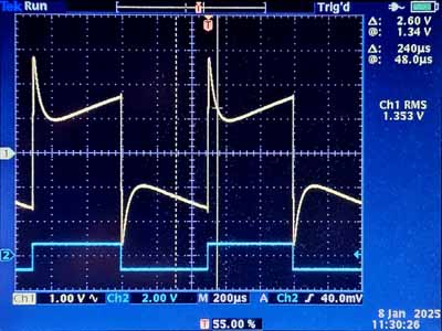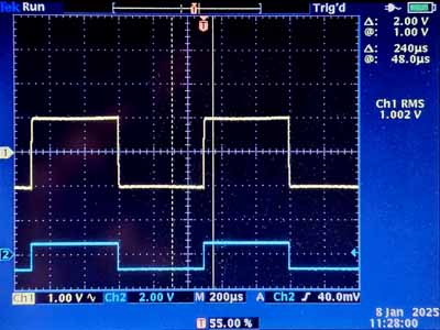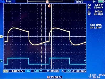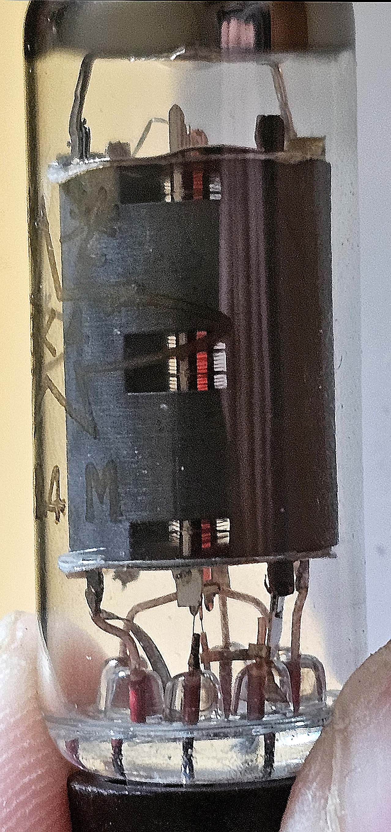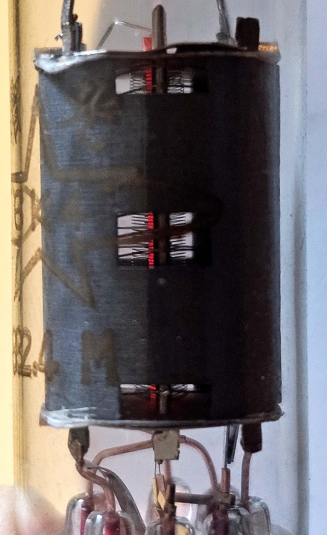 Il s'agit en fait d'un tube russe et cela se voit assez bien à la construction intérieure qui est assez grossière. On voit à peine la première grille sur certaines photos (pas sur celle ci), mais on voit très bien la grille écran qui se trouve à distance entre la cathode et l'anode. Le pas est très serré, ce qui veut dire que le courant anodique sera faible, beaucoup d'électrons sont attirés par la grille écran. Le pas de la grille suppresseuse est très lâche. Ce tube thermo-ionique est un peu comparable au 6AK5/EF95, une pentode moyenne fréquence qui a été utilisée dans certains téléviseurs en Grande Bretagne. La tension de fonctionnement de ce tube est normalement de 120V. Le problème ici est que le module bluetooth est alimenté par un bloc secteur de 12V. C'est l'idéal pour alimenter les deux filaments en série, mais c'est trop peu pour la haute tension. Il est ici fait usage d'un petit multivibrateur pour fournir une tension de -12V. 24V, c'est fort peu pour une lampe, elle va probablement déformer le signal.