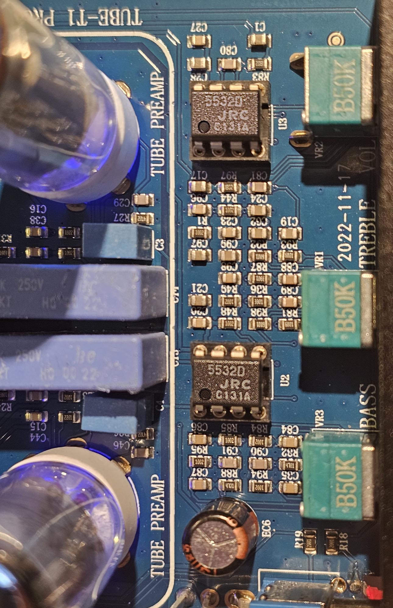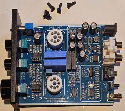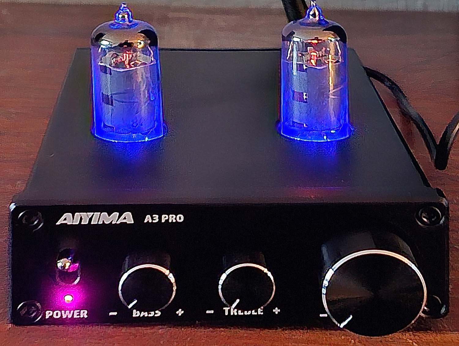 Voici comment le module se présente: un beau petit boitier métallique avec deux lampes thermo-ioniques sur le dessus. Comme il se doit maintenant, les lampes sont éclairées par le dessous via des leds bleues. Voici le Aiyima A3 PRO. Aucune idée comment cela se prononce. Frappez votre voisin avec un marteau sur le tibia et enregistrez ce qu'il dit.