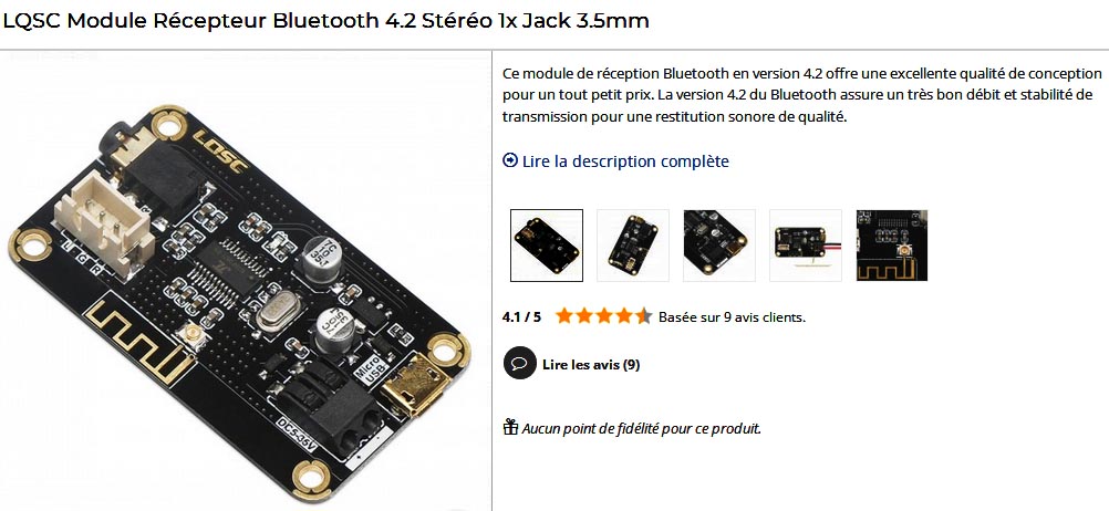 Vous voulez ajouter un récepteur bluetooth à un chaine hifi, vous réalisez un amplificateur stéréo hifi ou voulez ajouter un récepteur à une ancienne radio à lampes (il n'y a plus rien à recevoir sur les bandes AM)? Faites attention à ce que vous achetez: il y a vraiment du brol merde en chine. |