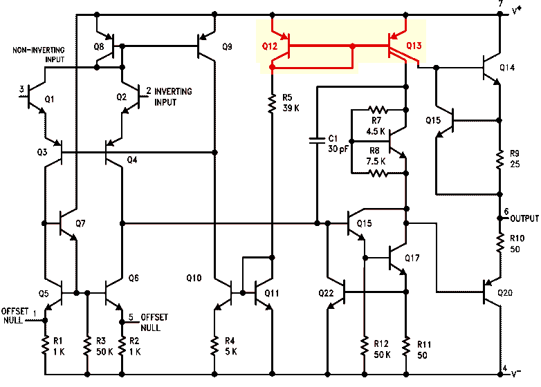 Un miroir de courant est indiqué en rouge sur le circuit d'un 741 bien connu, mais il y a encore deux autres miroirs, formés par la paire Q8-Q9 et Q11-Q10 (fonctionnement de gauche à droite pour cette dernière paire). Q13 a deux collecteurs, son fonctionnement est expliqué plus loin.