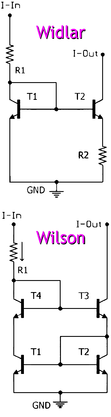 Dans la plupart des circuits intégrés on se contente de la version de base (avec seulement deux transistors). La symmétrie est suffisante pour la plupart des montages. Cette version de base a comme avantage une chute de tension moindre (0.65 au lieu de 1.7V) ce qui peut être important dans des circuits conçus pour des basses tensions. Le montage de wilson n'est pas recommandé pour des sorties multiples.