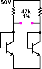 Mais il y a encore une légère asymmétrie: la tension de collecteur de Q1 est le double de la tension de collecteur de Q2. L'effet Early (du nom de la personne qui a décrit le phénomène) fait que le courant augmente légèrement avec la tension de collecteur.