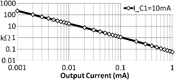 Les formules pour calculer le rapport du courant ne sont pas linéaires. Le courant sortant doit être calculé par des approximations successives. Voici le courant de sortie pour un courant à l'entrée de 10mA. Une résistance de 100Ω produit un courant de sortie de 0.4mA. Avec un courant si faible le transistor de sortie ne chauffe pas et l'approximation est assez correcte.