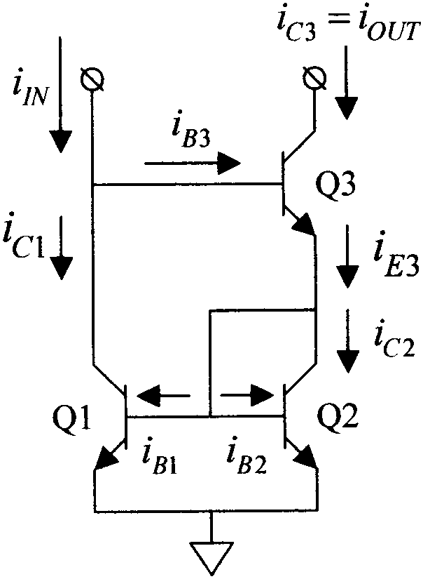 Quand le courant apparait à l'entrée, le transistor Q3 entre en conduction et transmet le courant aux miroirs Q2 et Q1. Ici c'est en fait Q2 qui est l'entrée du courant (et également la sortie su courant).