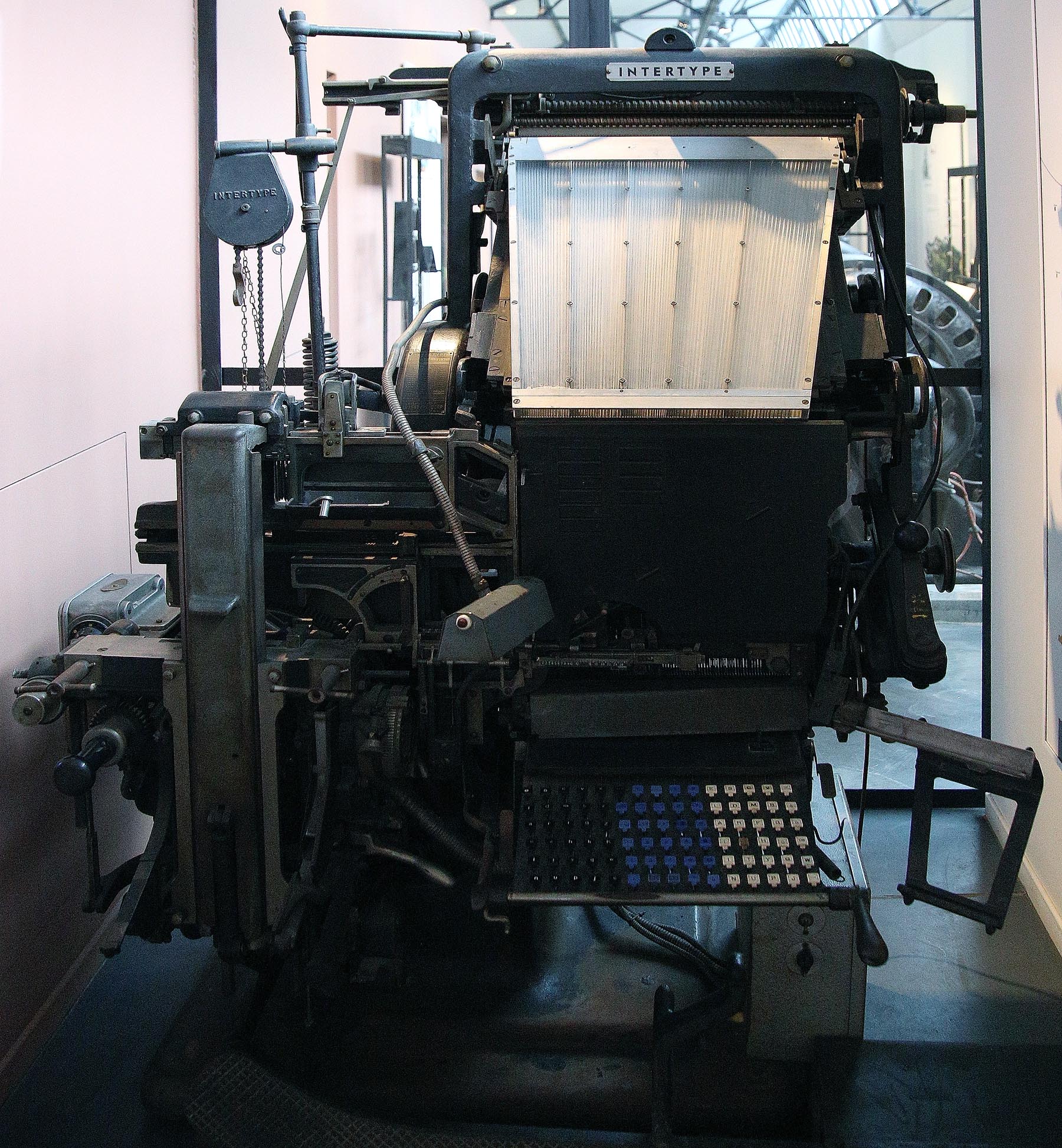 Rechts een Intertype, een letterzetmachine (vergelijkbaar met de Linotype) te zien in het museum. Deze machine werd gebruikt om snel de tekst voor dagbladen te zetten. De regels tekst werden automatisch in lood gegoten. Deze machine wordt in details besproken op de pagina over de drukkerijen.