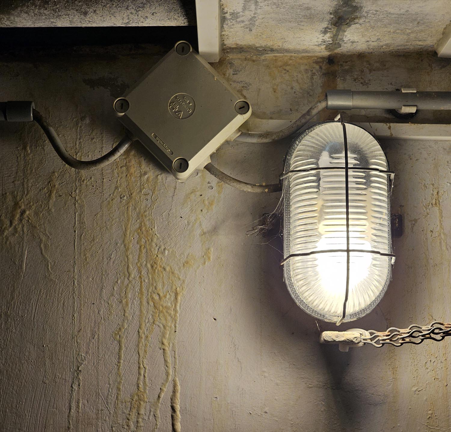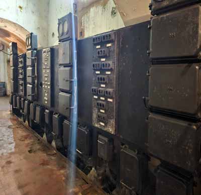De elektrische verdeelkasten in het fort. Het totale vermogen van 672kW is laag gezien de omvang van het fort. Naast verlichting waren er ook de watercirculatiepompen, ventilatoren en grote motoren nodig om de kanonnen te kunnen draaien.