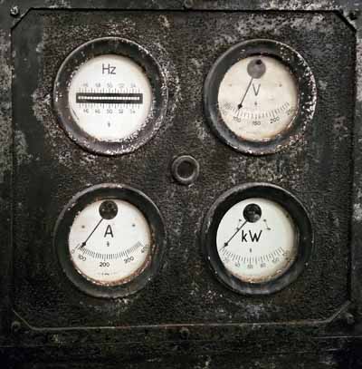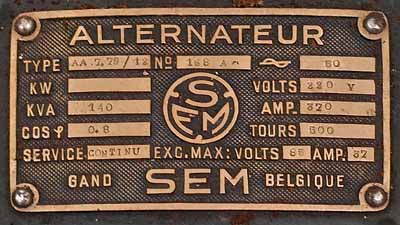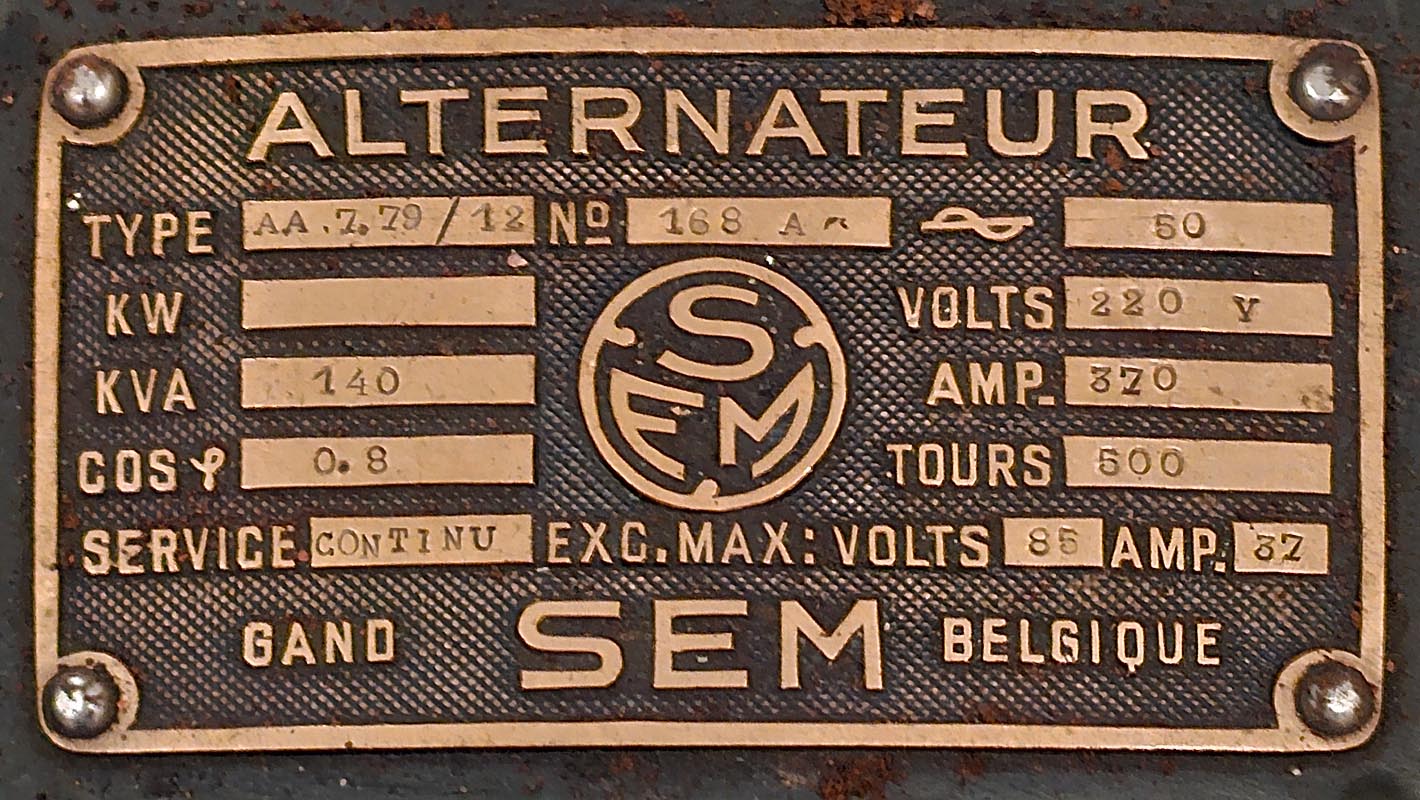 Een bord met aanduiders voor de netfrequentie (de frequentie wordt aangepast door de hoeveelheid brandstof die in de motor wordt geïnjecteerd te veranderen). Dit apparaat maakt gebruik van een reeks afgestemde strips, waarvan er slechts één trilt. Vervolgens is er de netspanning (220V, destijds al de standaard netspanning). De stroomsterkte gemeten op één fase is 370A en het vermogen van een alternator is 112kW.
