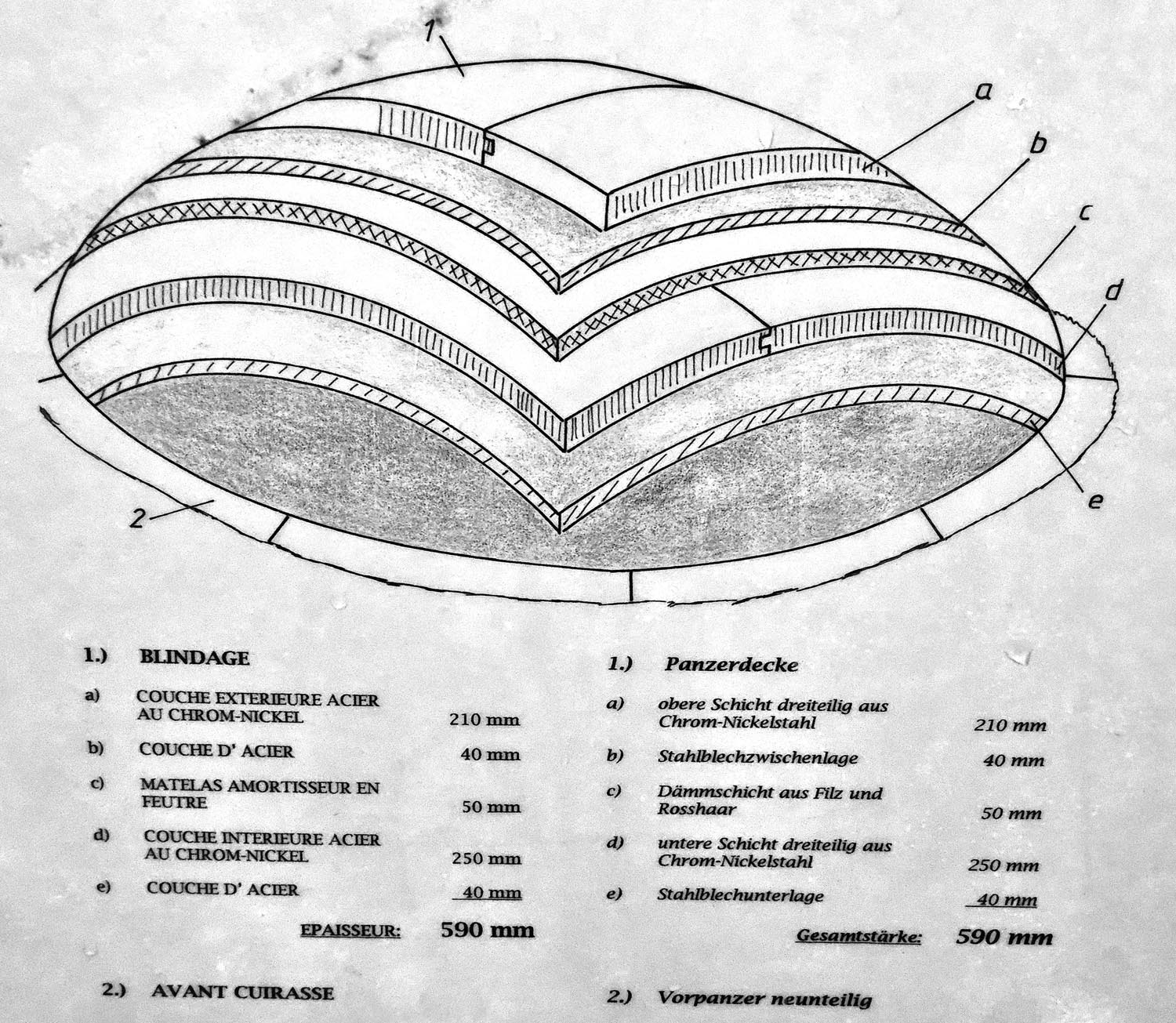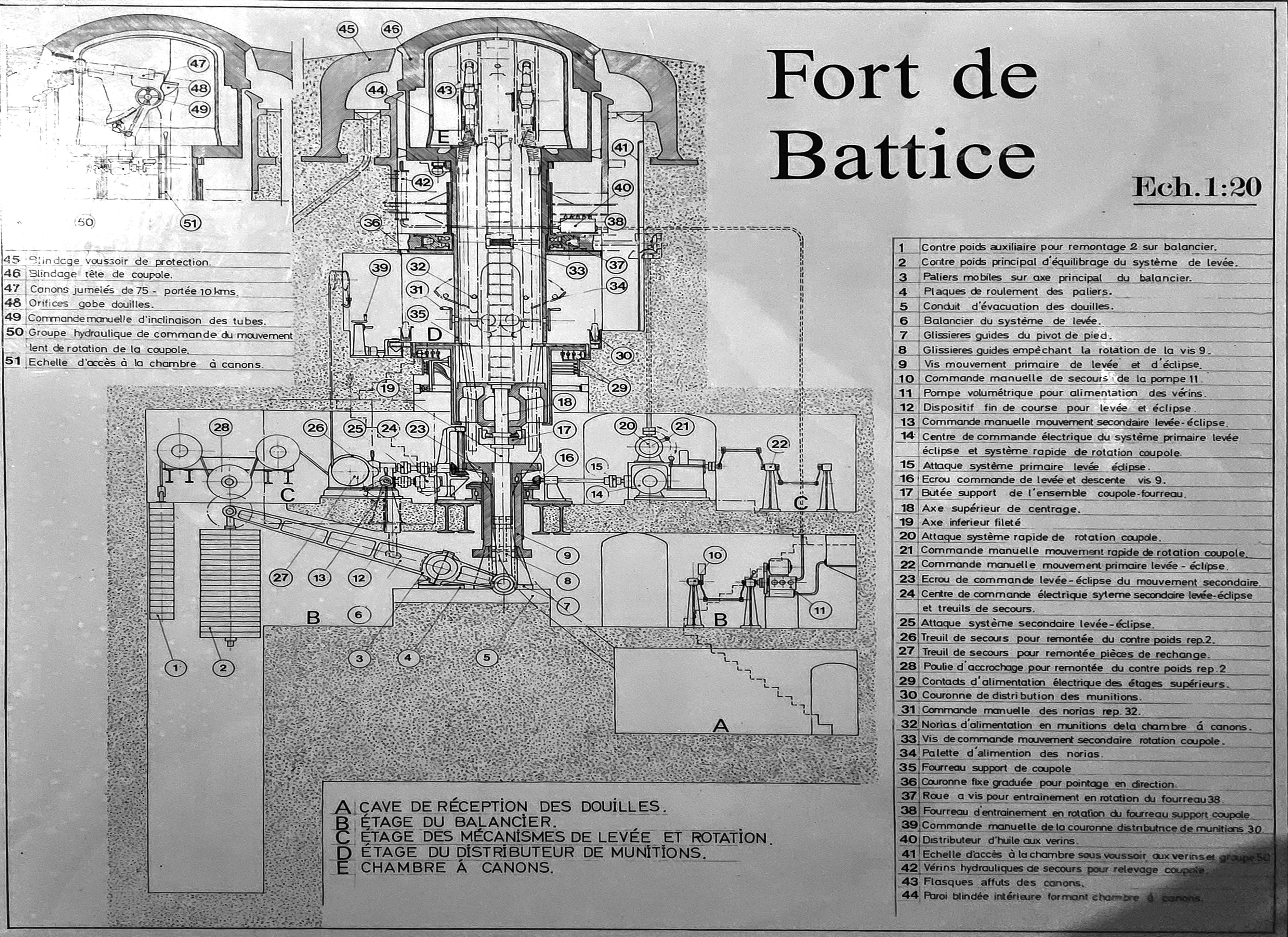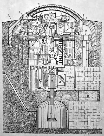 La coupole est entourée d'une collerette en acier ("blindage voussoir de protection") pour éviter que des débris ne tombent dans le mécanisme quand un obus ennemi tombe à coté de la tourelle et fait voler de la terre et des pierres. On voit aussi très bien le mécanisme pour faire monter et descendre la tourelle de tir avec le balancier. La commande se fait via le balancier. La mécanique pour faire tourner la tourelle est moins visible sur lé découpe.