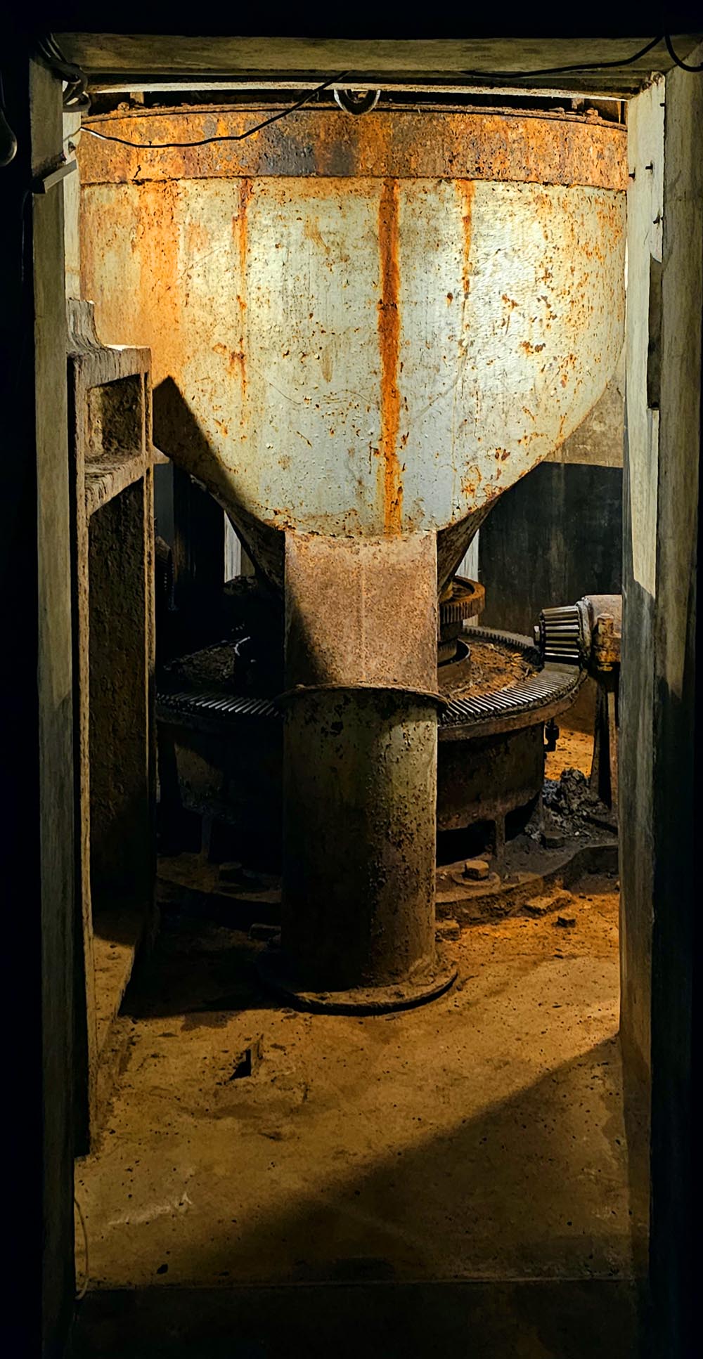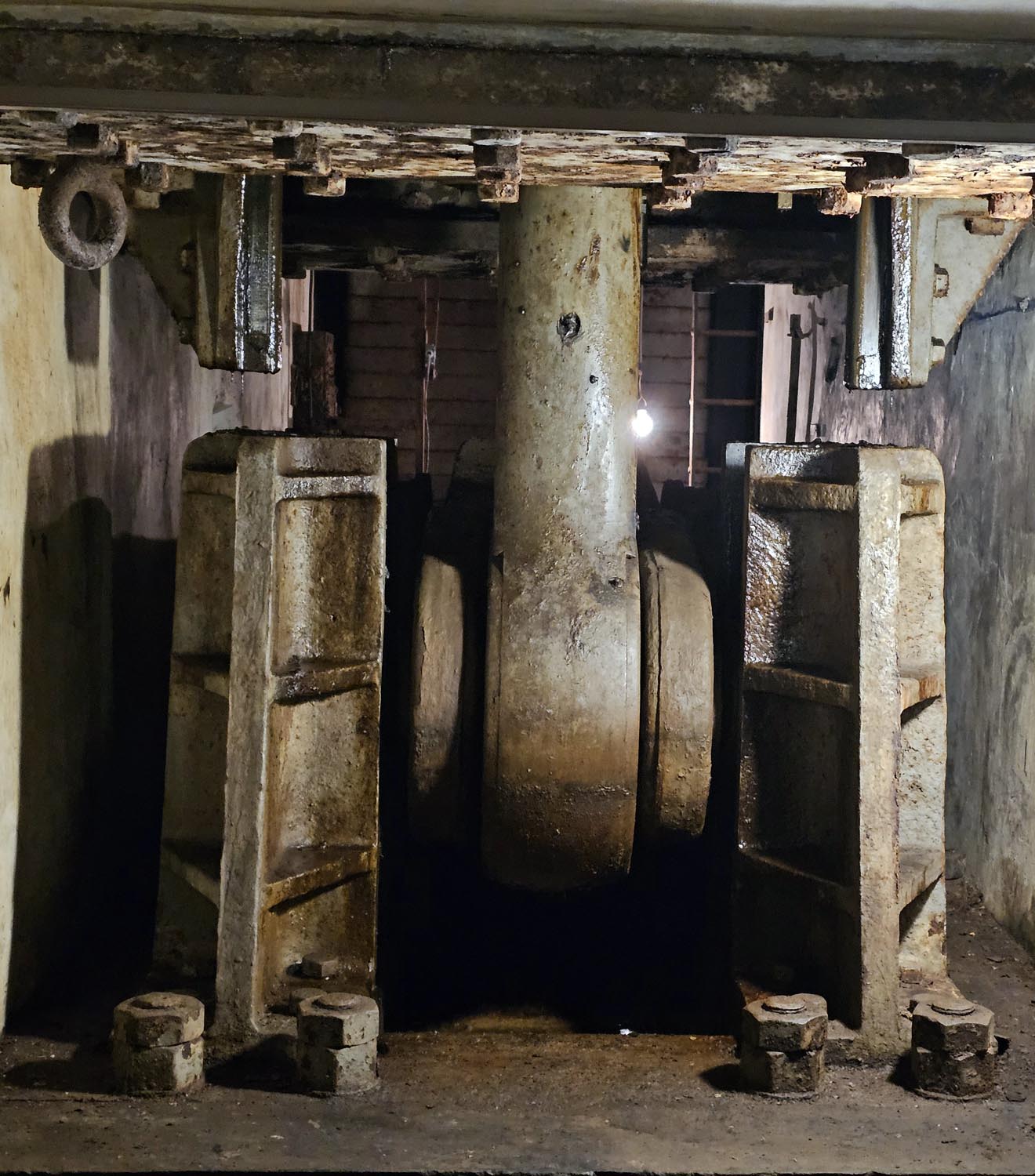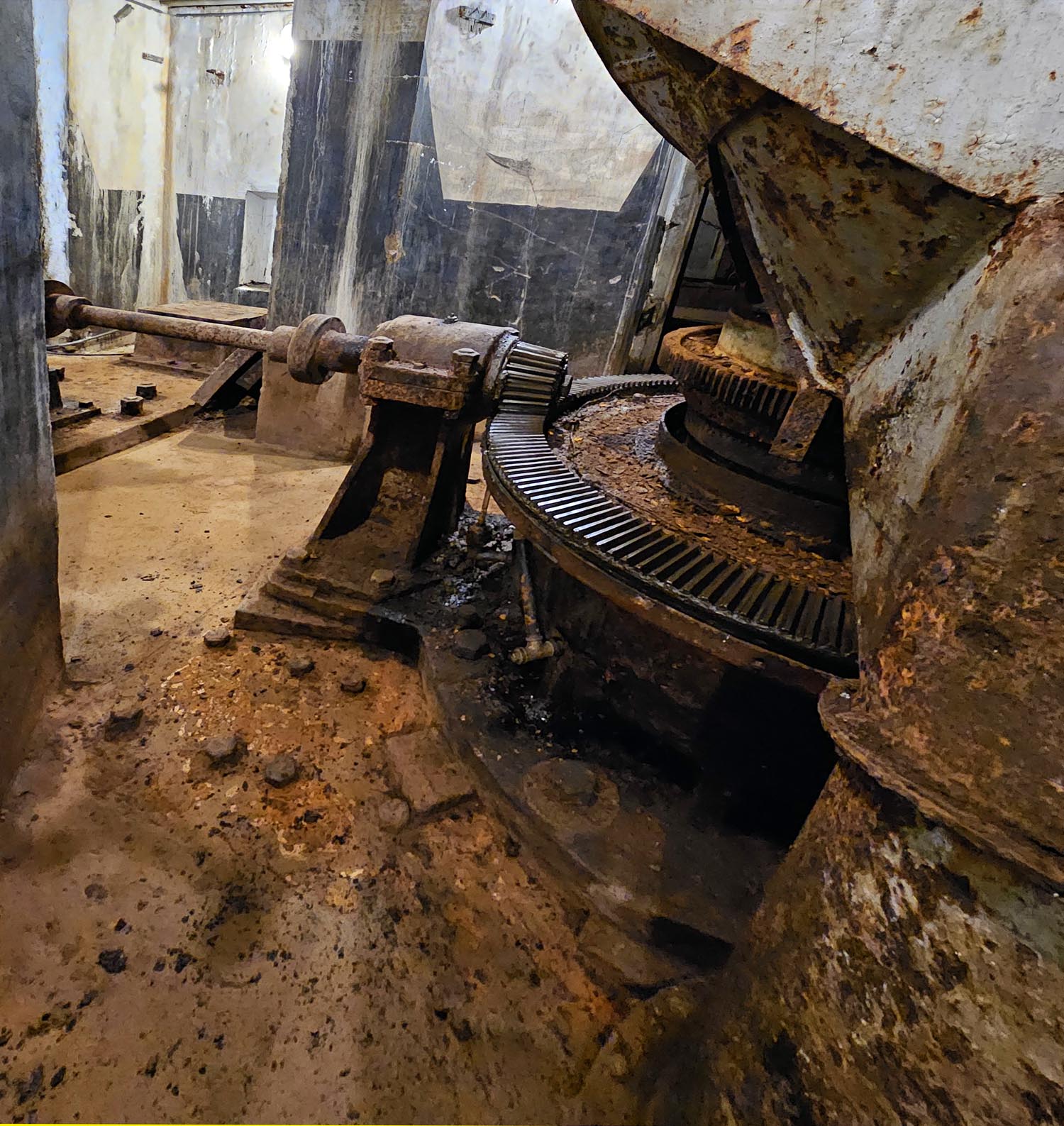 On arrive ensuite à la salle des machines, qui s'étend sur plusieurs étages. On voit ici une partie du mécanisme pour faire tourner la tourelle, les canons et les accessoires. Si nécessaire, on peut tout tourner à la main. Il faut également un mécanisme pour faire s'élever la coupole avec les canons.