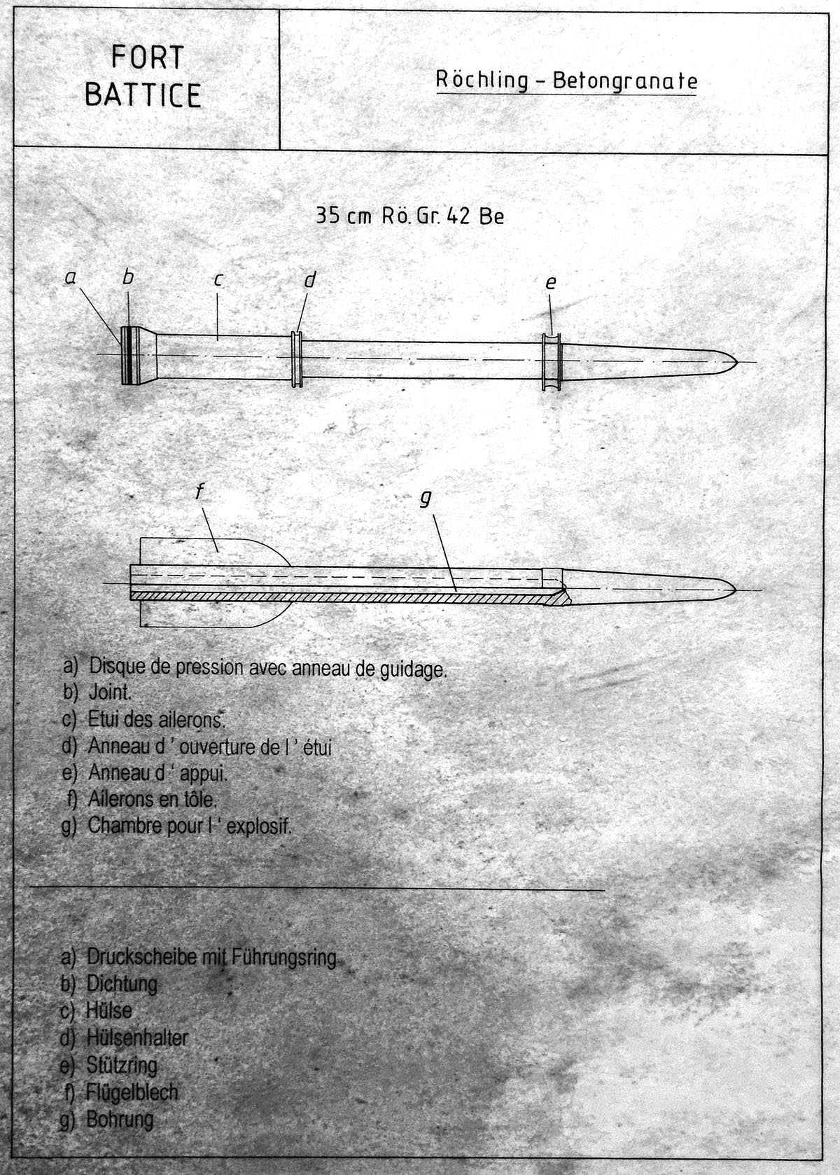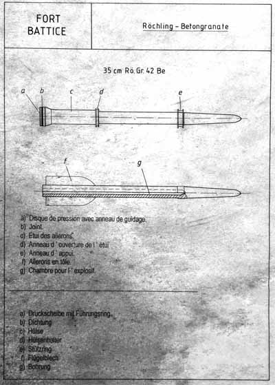 Les canons RöchlingL'obus Röchling était une invention allemande. C'était un obus effilé qui était envoyée pratiquement à la verticale (il était tiré comme un mortier), jusqu'à une hauteur de 11km. En retombant l'obus atteignait une vitesse très élevée et c'est cette énergie cinétique qui permettait de transpercer le béton armé.Le fort a été utilisé pour tester cette arme. On tirait à blanc, avec la charge explosive remplacée par du sable, le but était de controler la profondeur que l'obus pouvait atteindre (au minimum 50m dans de la terre). Le canon Röchling n'a que très peu été utilisé pendant la guerre car il n'était pas précis. Avec une trajectoire si élevée, le moindre vent en altitude faisait se dévier l'obus et avec un vent contraire il se pouvait très bien que l'obus retombe sur les allemands.