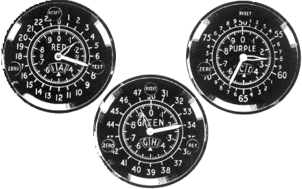 Links de Decca-aanduider: iedere aanduider geeft de betreffende hyperbool aan van de rode, groene of paarse zendmast. Men moet dan nog enkel op de kaart kijken waar de lijnen kruisen. Om verwarring te vermijden worden de hyperbolen genummerd van 0 tot 23, 30 tot 47 en van 50 tot 79. De middenste indicatie is een onderverdeling, gaande van 0 tot 0.9. De aanduiders geven rood 6.15, groen 33.9 en paars 67.3.