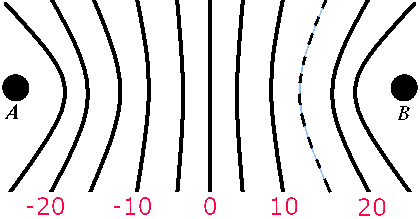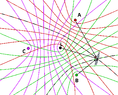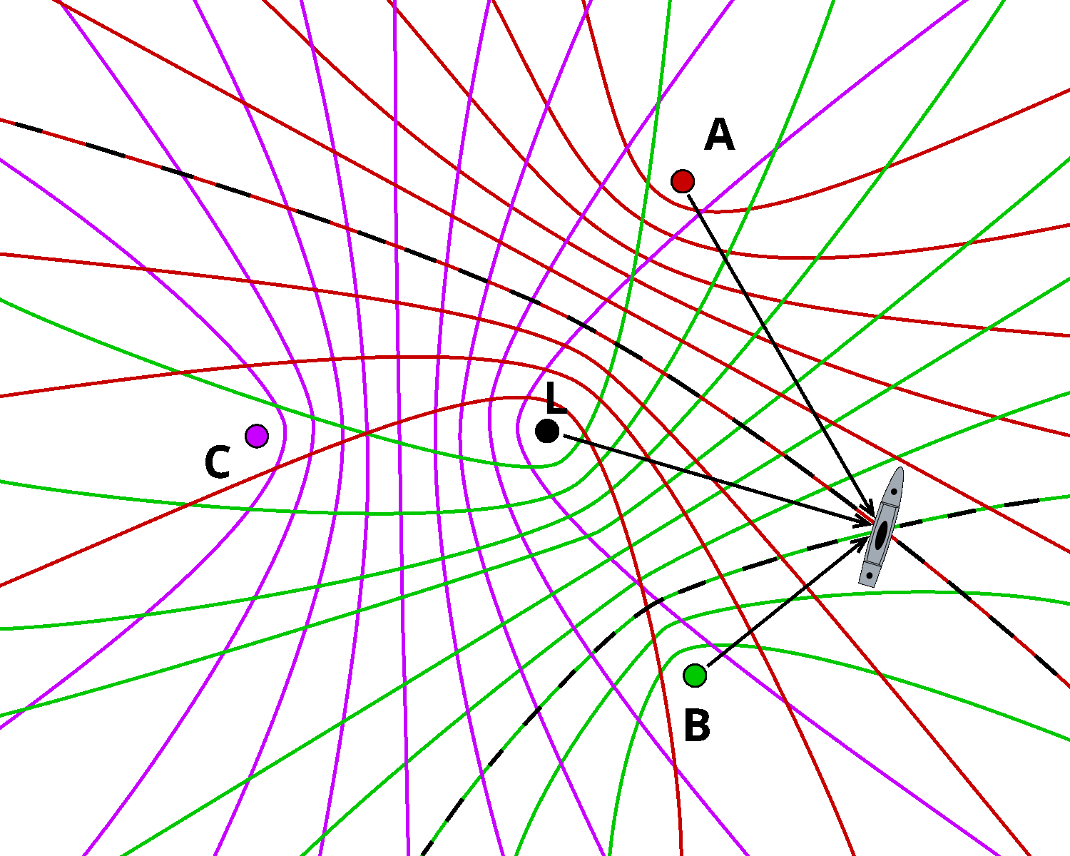Hyperbolische navigatie en trilateratieAls we niet de hoek naar de zendmast kunnen meten, waarom dan niet de afstand tot de zendmast? Dit is het principe van wat men hyperbolische navigatie noemt. Als men twee gesynchroniseerde radiobakens gebruikt, dan is de positie van het schip (of het vliegtuig) op een hyperbool gelegen.Als het tijdsverschil tussen het signaal van zendmast "A" en zendmast "B" +15µs bedraagt, dan kan het schip of vliegtuig zich enkel op de aangegeven hyperbool bevinden. Door gebruik te maken van een tweede paar zenders (trilateratie) kan men de positie bepalen: die ligt op de kruising van de twee hyperbolen. Men zal ofwel een tweede groep (met twee zenders A' en B' gebruiken, ofwel één enkele groep met 4 zenders: een master en drie slaven. Soms zijn er maar twee slaven als men geen navigatie rondom de zenders nodig heeft, maar aan slechts één kant (zenders die langs de kustlijn geplaatst zijn).