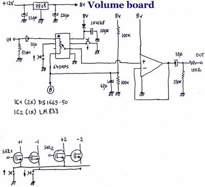 Het voordeel van een electronische volumeregeling is niet evident in vergelijking met een normale potentiometer (behalve dat je geen gekraak hebt), maar aangezien ik toch een source-selectie moest maken, heb ik besloten alles electronisch te laten verlopen. Uiteindelijk heb ik gemerkt dat de audio-eigenschappen (overspraak, ruis en gekraak) veel beter waren met een volledig electronische schakeling.